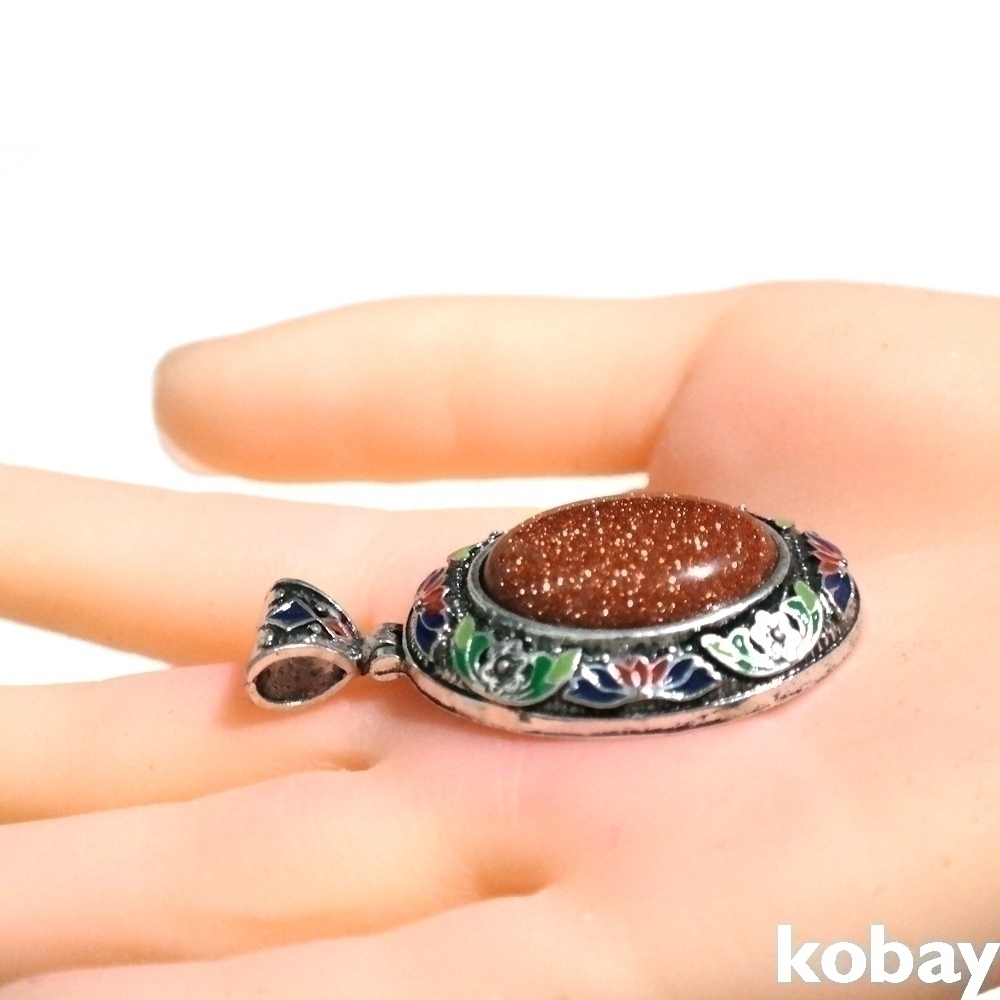 칠보로 만들어졌으며 사금석으로 만들어진 알이 박혀있는 펜던트 입니다.