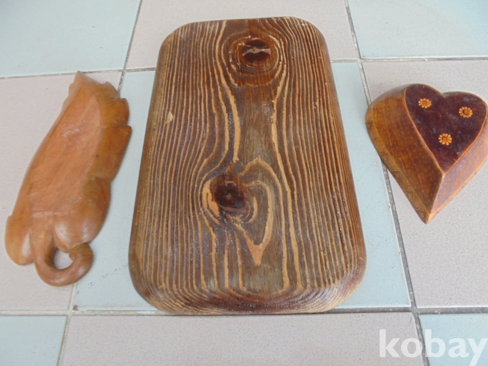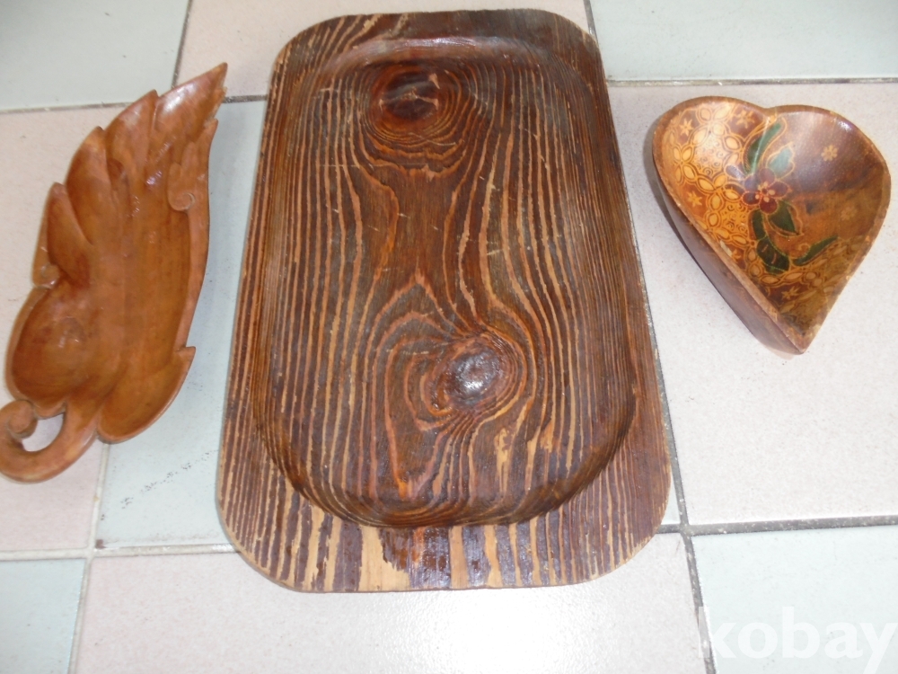 무늬있는소나무류로 사각형 큰쟁반 그릇과 피나무류 나뭇잎모형의 쟁반그릇 특수한 나무에 꽃그림들어간 하트모양의 그릇 총3점