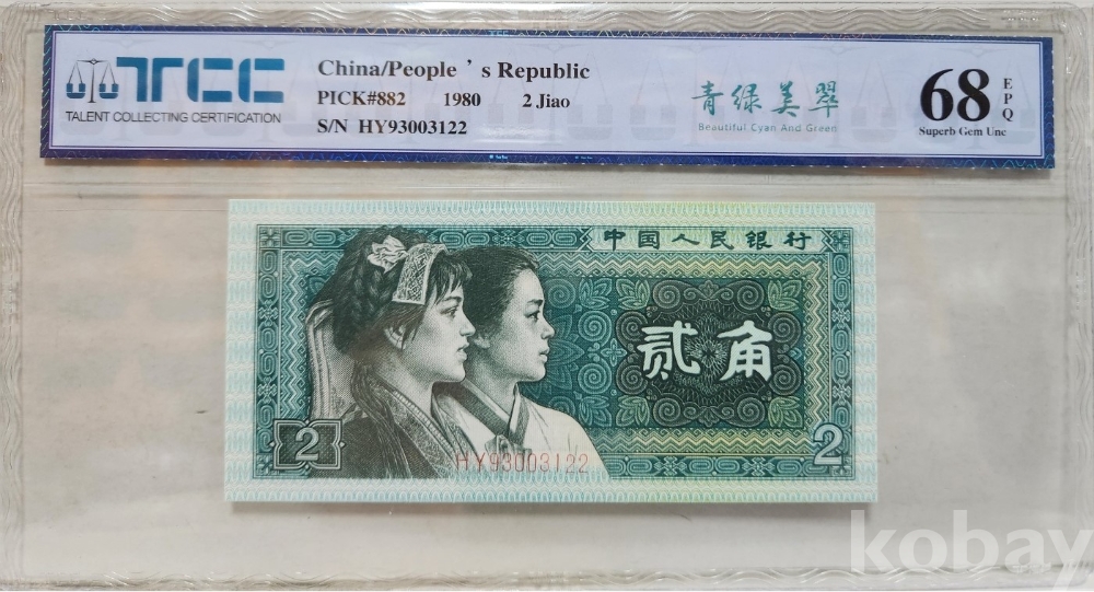 -1980년 중국 인민은행 발행 2각 지폐 TCC68 고등급 입니다.