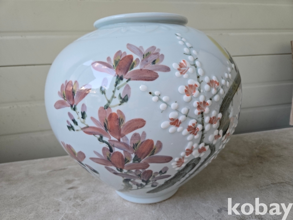 새와 매화 꽃 표현 달 도자기 입니다.