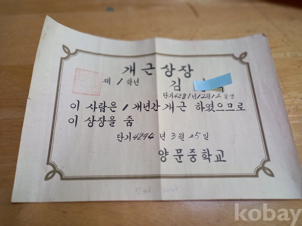 신 316) 양문중학교 개근상장 4294년