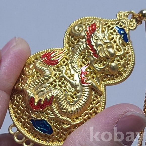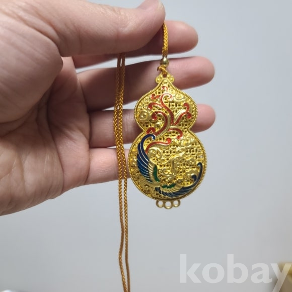 금빛의 동제품에 칠보 기벞으로 장식한 목걸이 형 노리개입니다. 새제품으로 다양하게 활용할수 있습니다
