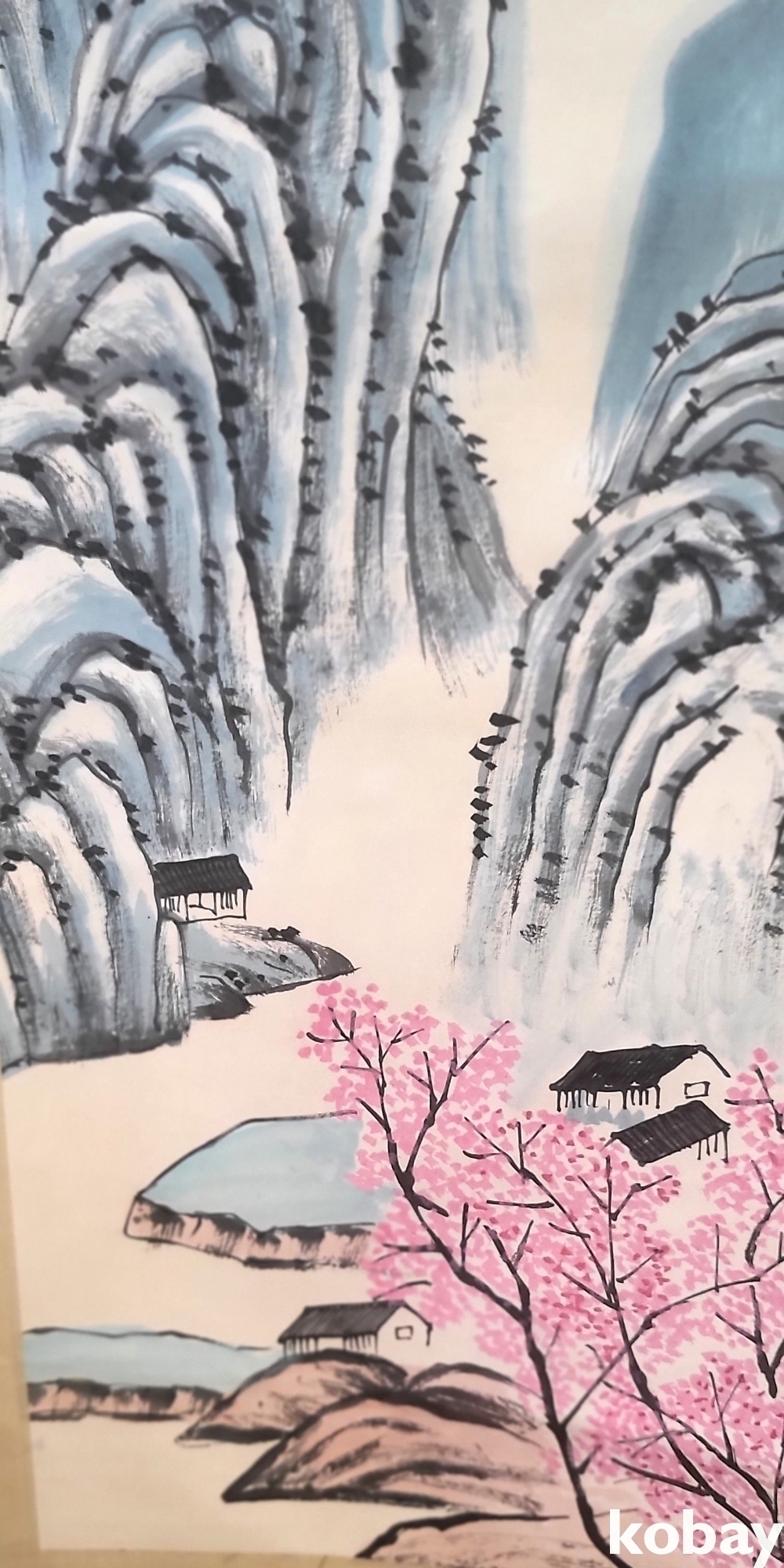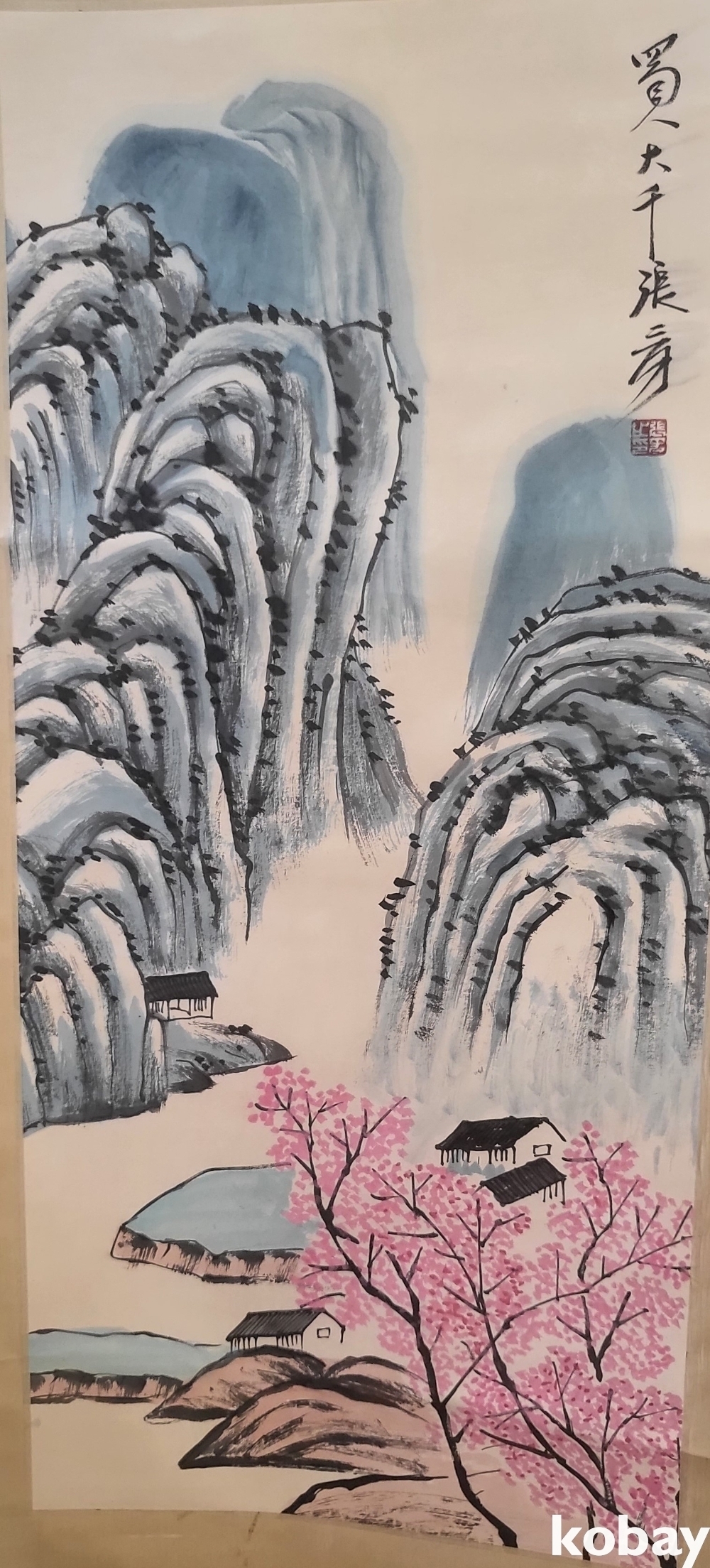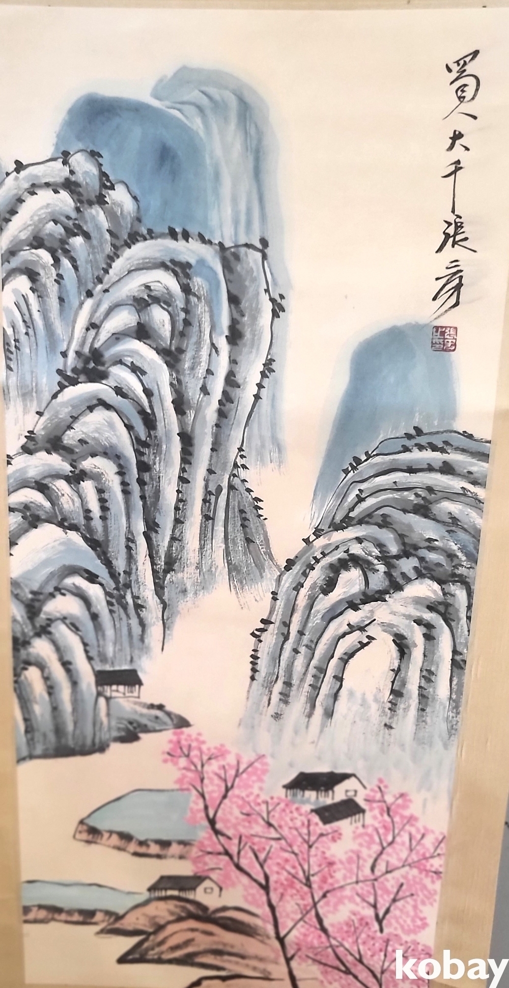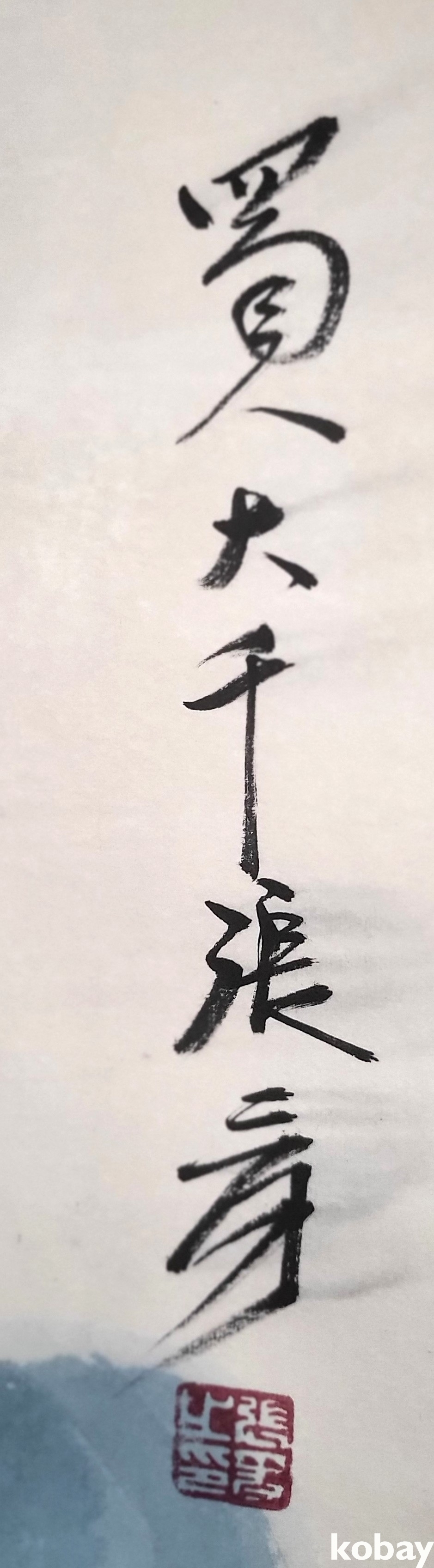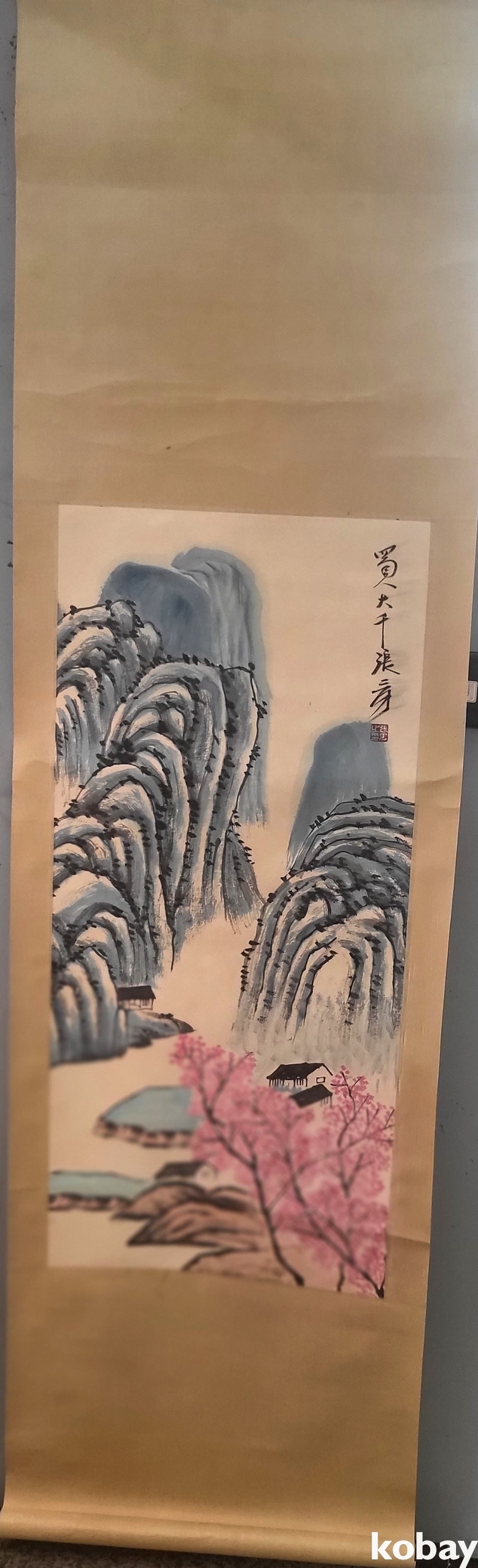 중국 유명화가 촉인 장대천 수결 종이에 채색된 산수화 족자입니다,