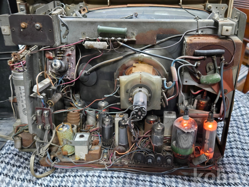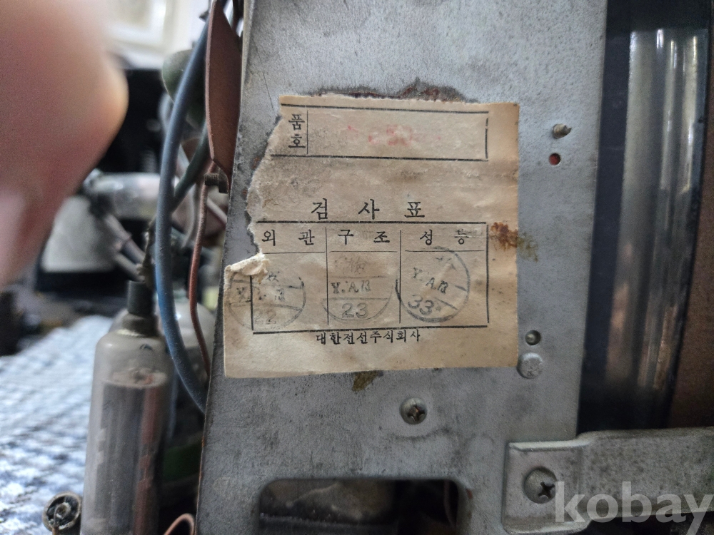 상태는 사진보시듯 외관 파손부위와 유실부위 전혀 없이 대체로 양호하며 작동상태는 전체진공관 정상점등되며 지ㅇ~하는 사운드가 들리는 상태입니다. 아쉽게 화면까지 나오지는 않습니다만 전체적인 회로상태를 볼때 정상복원가능성이 높다고 봐야겠죠~