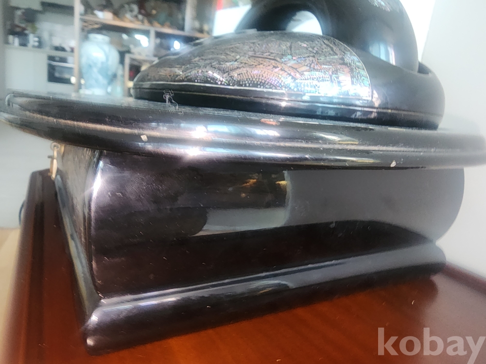 단순한 전화기가 아닌, 한국 전통 나전칠기 공예가접목된 예술품 같은 제품입니다. 세월이 무색할 정도로 자개의 영롱한빛깔이 잘 살아 있으며, 하단에메모용 서랍이 있는 모델이라 희소성이 매우 높습니다.