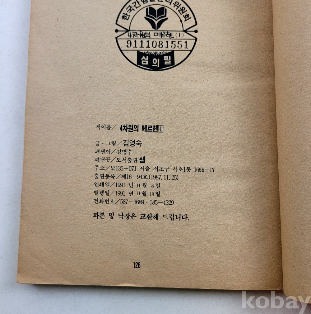 물 품 명 | 김영숙 / 4차원의 메르헨(1~4) 총4권 / 희망문고 / 1991년 초판 / 도서출판 샘 |