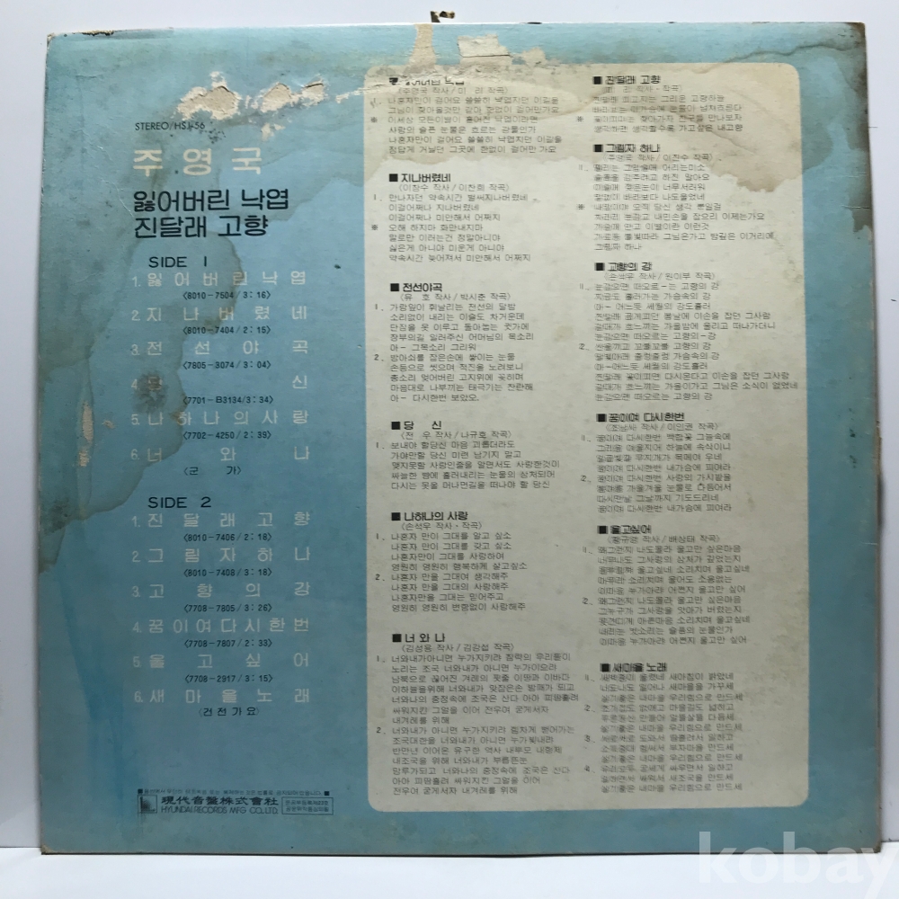 | 자켓상태 | G : 눈에 띄는 손상, 테이프, 필기 존재 | 음반상태 | EX : 재생에 영향 없는 가벼운 기스 존재 | 발매정보 | 알수없음 | 가사지여부 | 무 |