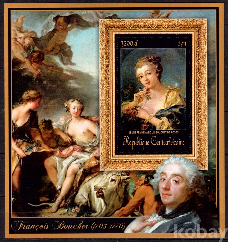 (누드명화) 중앙아프리카 2011 Francoise Boucher 장미 꽃다발을 든 젊은 여인 deluxe sheet MNH
