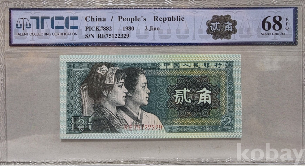 -1980년 중국 인민은행 발행 2각 지폐 TCC68 고등급 입니다.