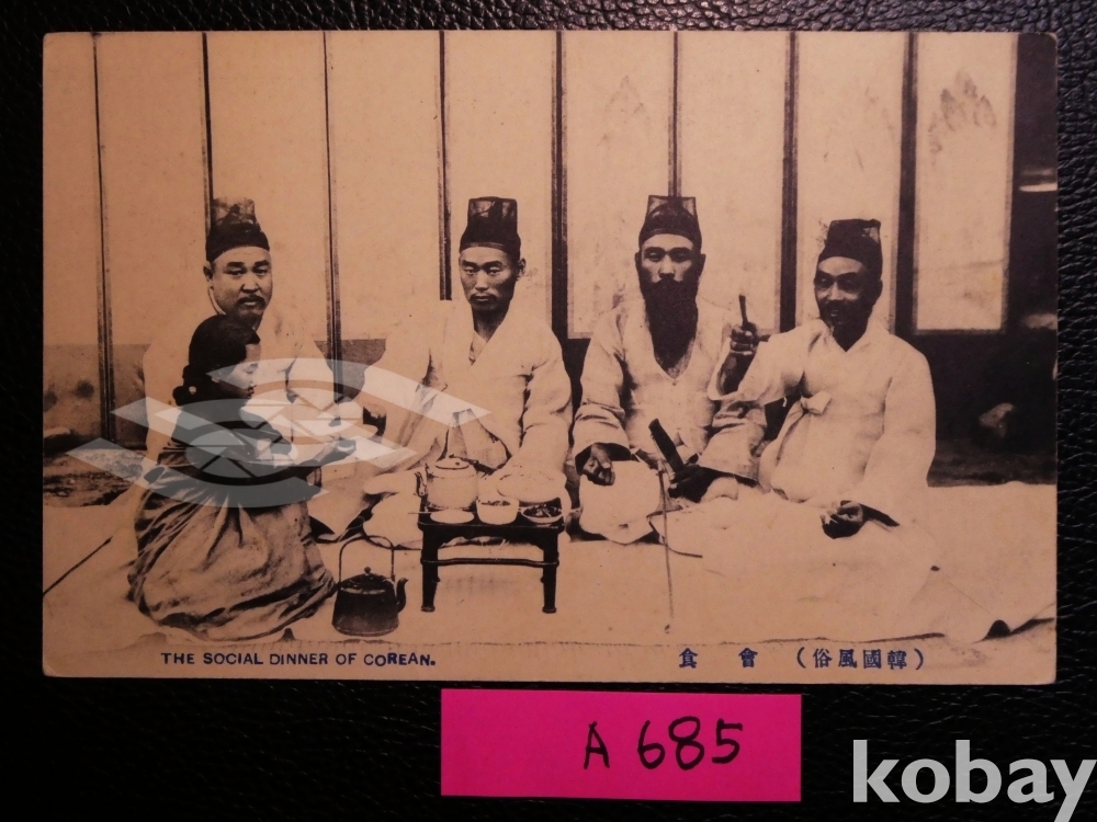▣근대한국엽서(진본): [조선풍속] 조선의 회식 모습(한국풍속), 1910년 합방 이전에 발행된 것/1매/귀함/역사자료/히노데상행/일제강점기 사진엽서, 그림엽서, 회엽서. A685