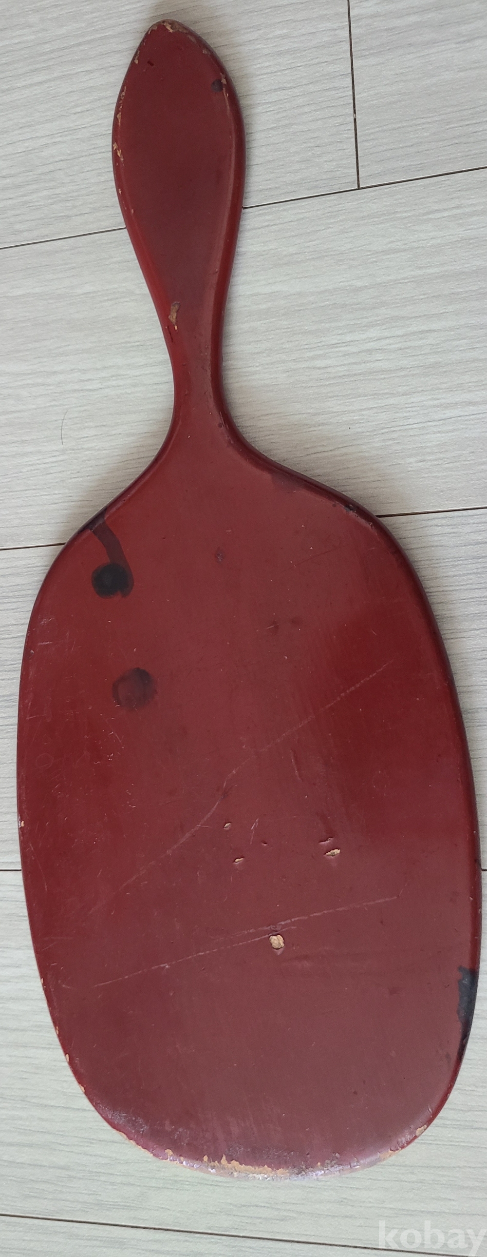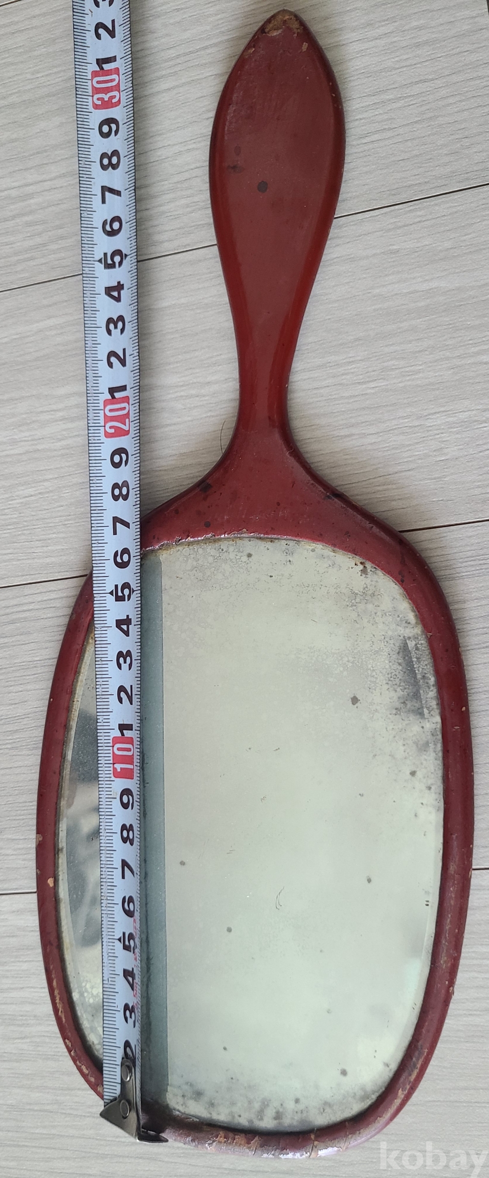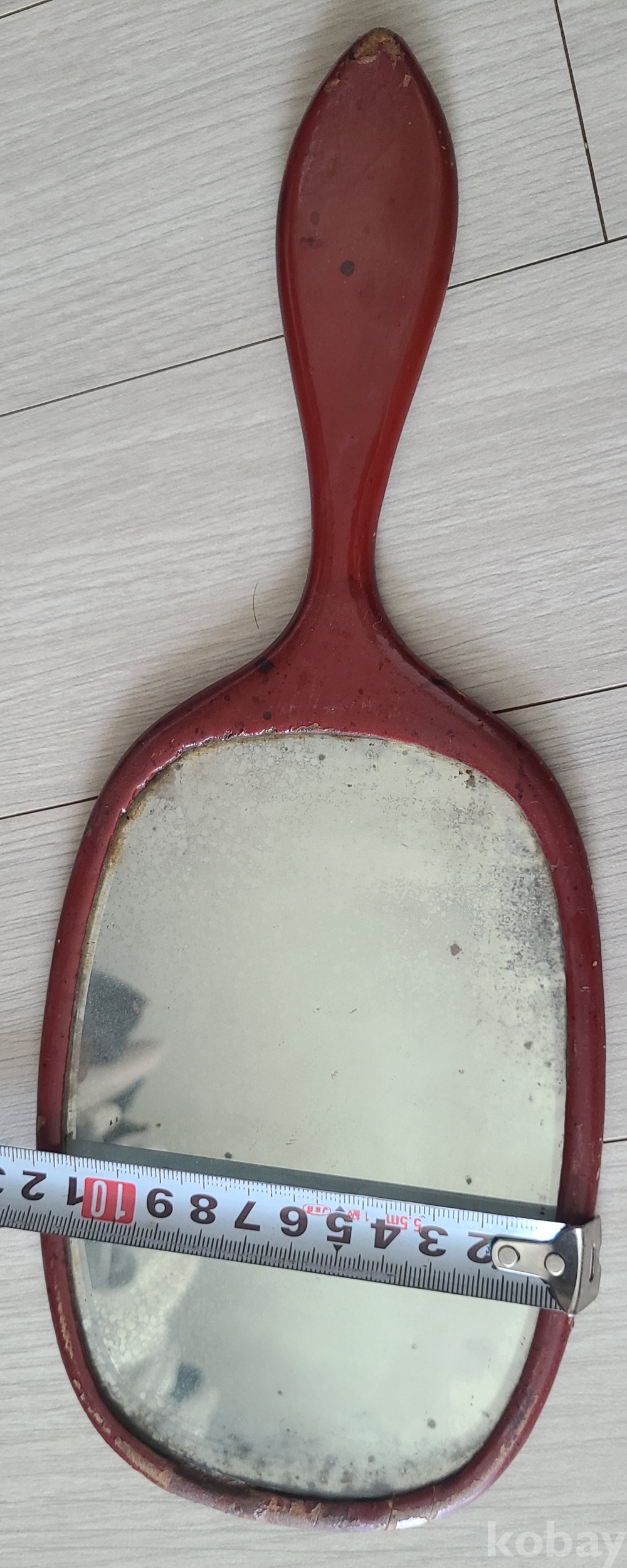 전체적으로 붉은색을 띠고 있으며, 손잡이와 거울 부분이 일체형으로 디자인되어 있습니다. 거울 부분은 세월의 흔적으로 인해 흐려지거나 얼룩이 있으며, 일부는 벗겨짐이 보입니다. (사진을 확대하여 확인 부탁드립니다.)