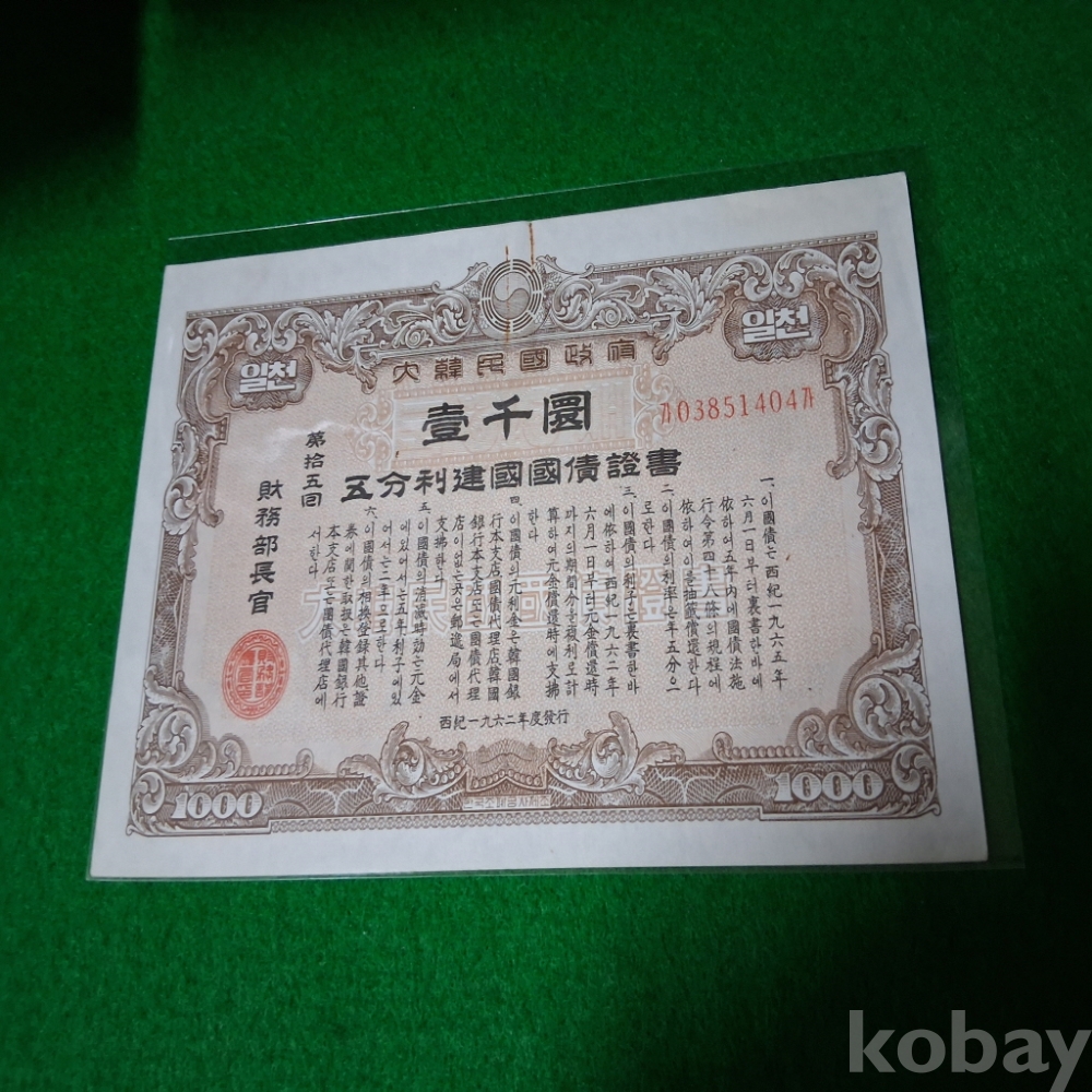 대한민국 1962년 건국채권 15회 1000환 사용제