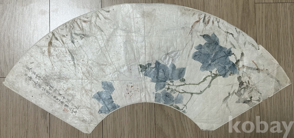 본 작품은 일본 전통 부채형(扇面 형식)을 기반으로 제작된 화조도 계열 채색 회화로, 청회색 계열의 꽃과 가지 표현이 중심이 되는 섬세한 붓 터치와 여백 활용이 특징이다. 전체 화면은 반원형 구조로 구성되어 있으며 전통 일본 회화 특유의 간결한 필선과 수묵 담채 기법이 혼합된 양식을 보여준다. 종이 바탕에는 자연스러운 세월감과 접힘 자국, 생활 보관 흔적이 존재하나 이미지 훼손은 크지 않으며 장식용, 컬렉션용, 액자 제작용으로 활용 가치가 충분한 작품이다. 부채 그림 특유의 희소성과 인테리어 활용도가 높은 소품 회화로 평가된다.