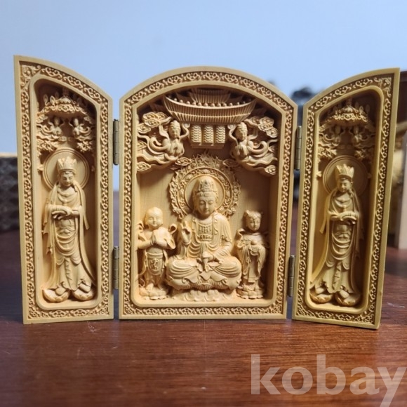 섬세하게 조각된 나무 불감입니다. 경첩이 달려있어 닫을 수도있고 펄쳐 둘수도 있습니다. 장식용으로도 좋고 작아서 호신용으로 가능합니다. 즐거운 감상되세요