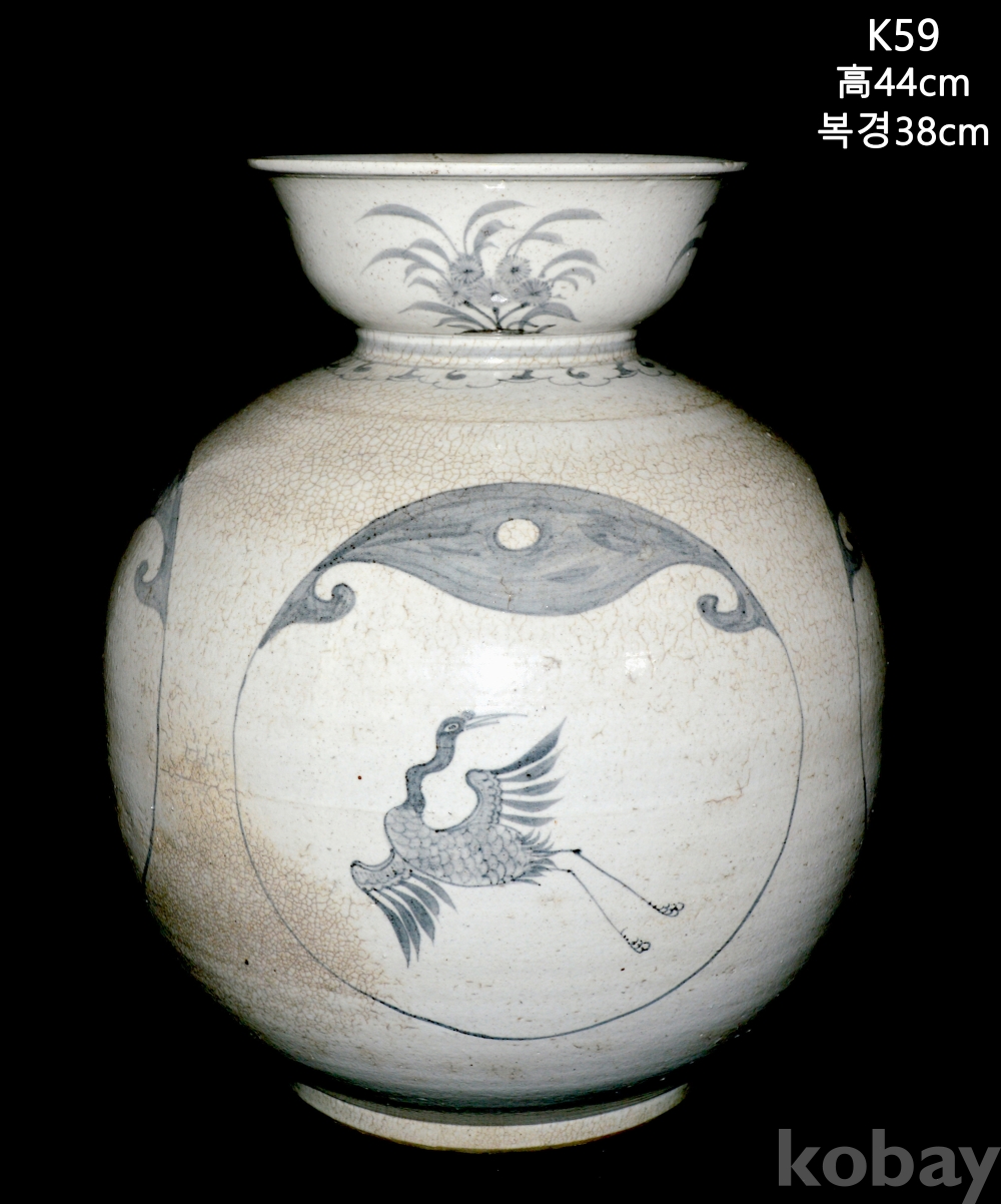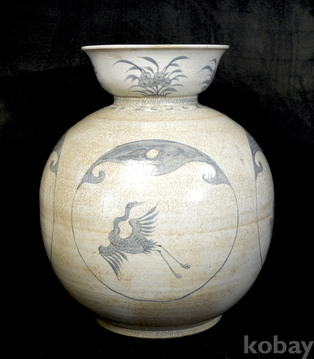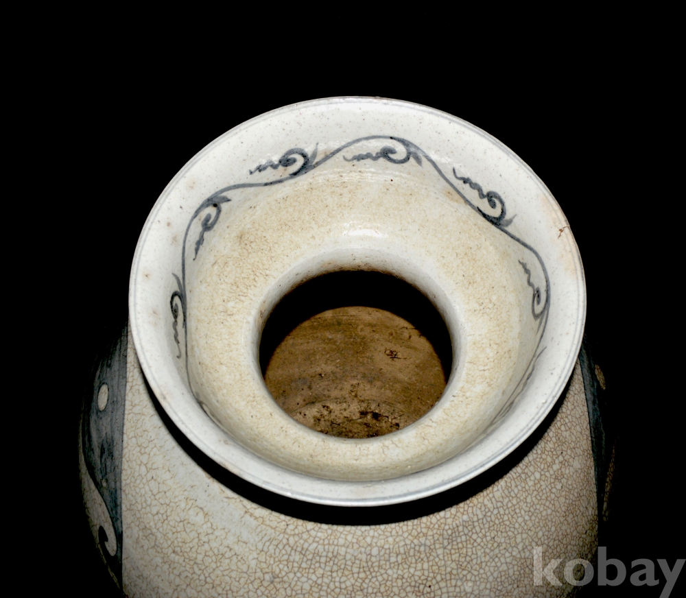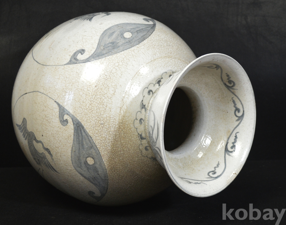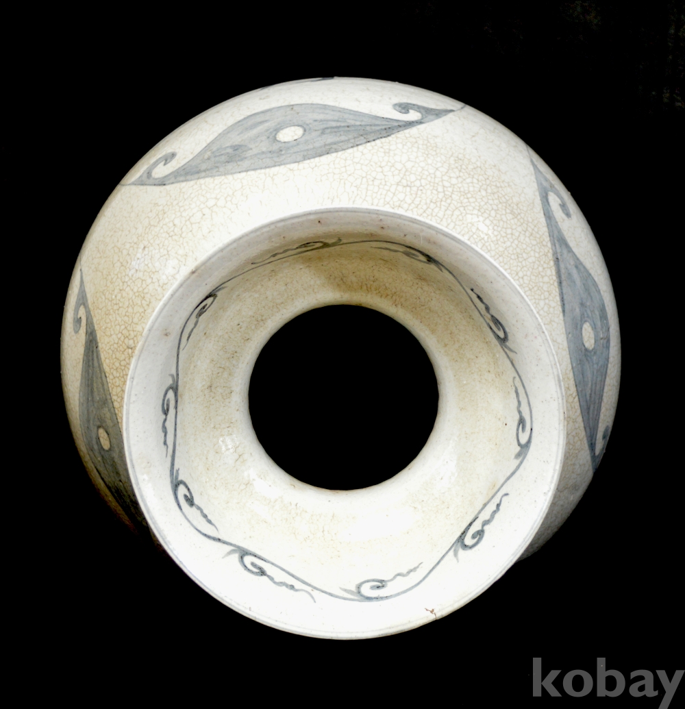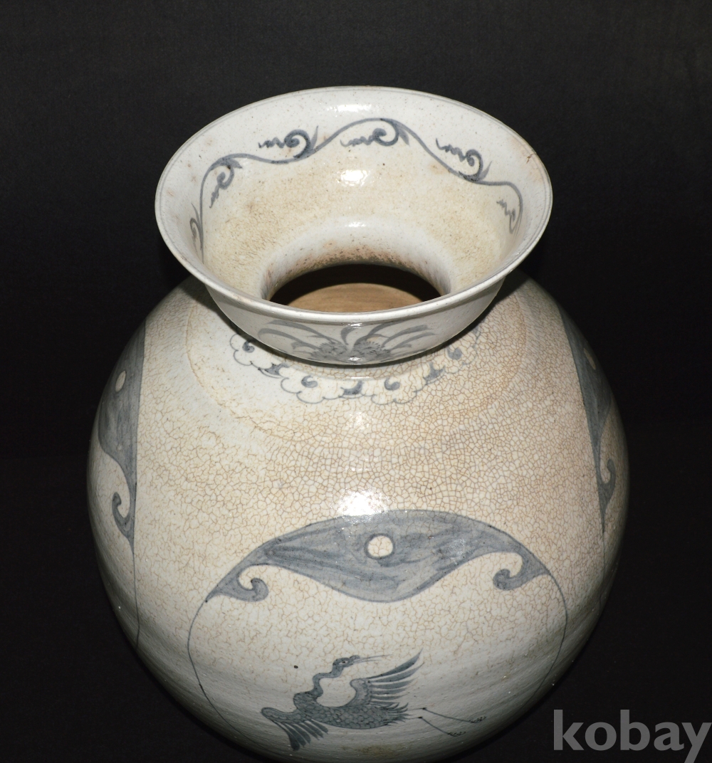 무늬도 아주 독특하여 원형의 개광 안에 구름에 가려져 희미해진 보름달 아래 학이 갈 곳을 잃고 날개짓 하는 낭만적이 장면을 그려 놓은 수준급의 명화(名畵) 입니다. 목에는 여의두문을 둘러 놓았고 올려놓은 사발에는 국화꽃을 수 놓았습니다.