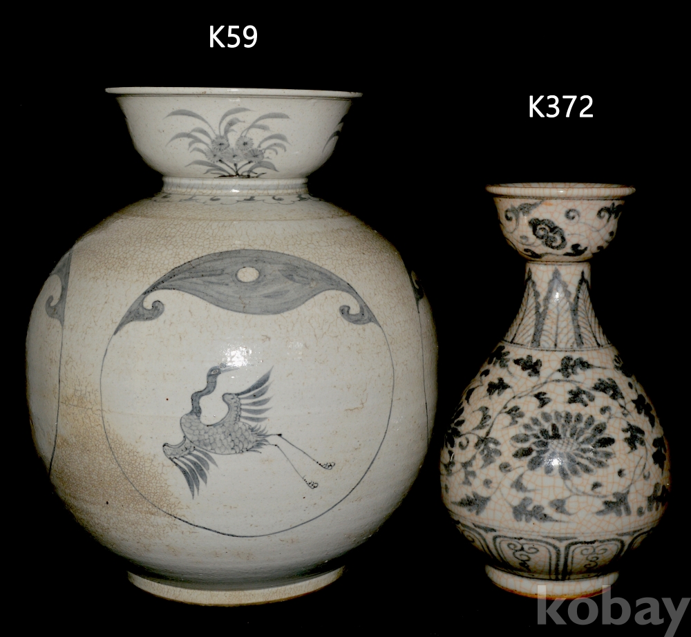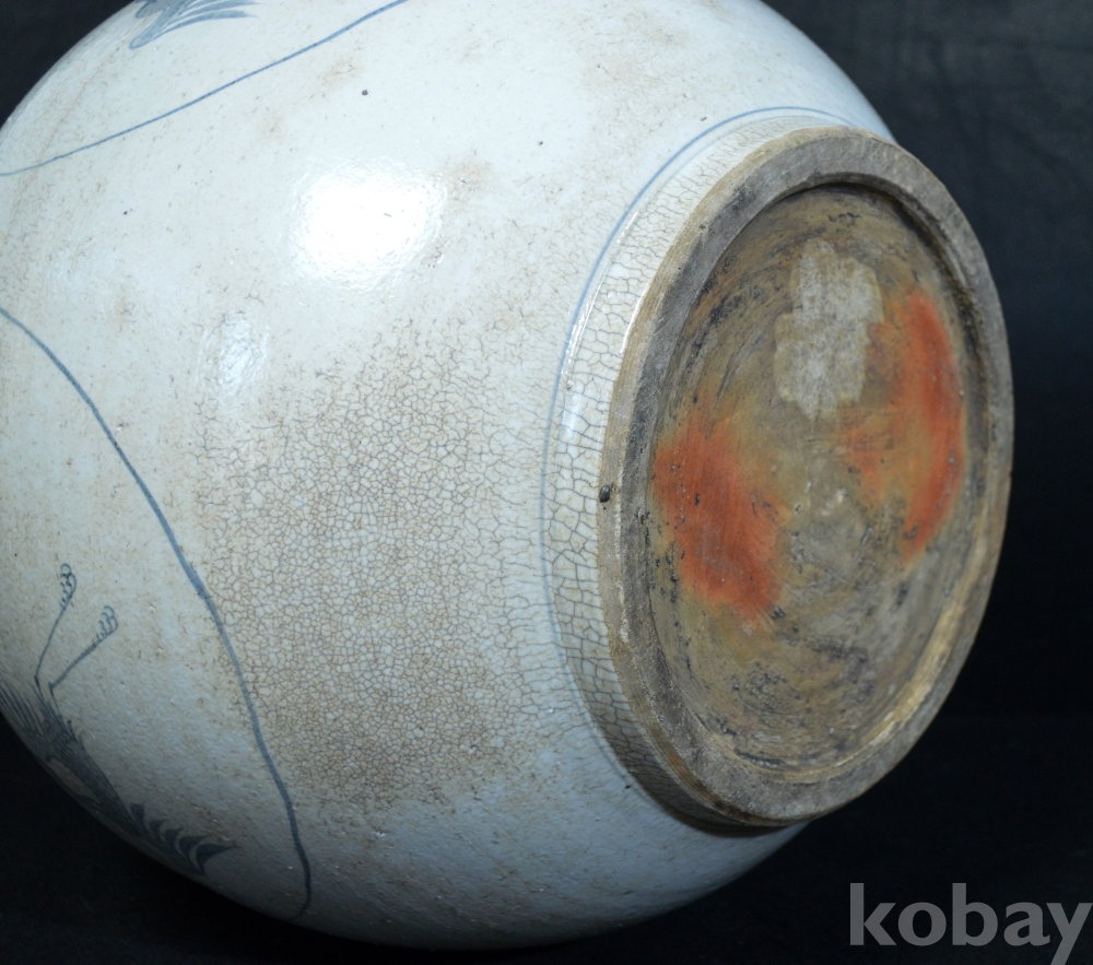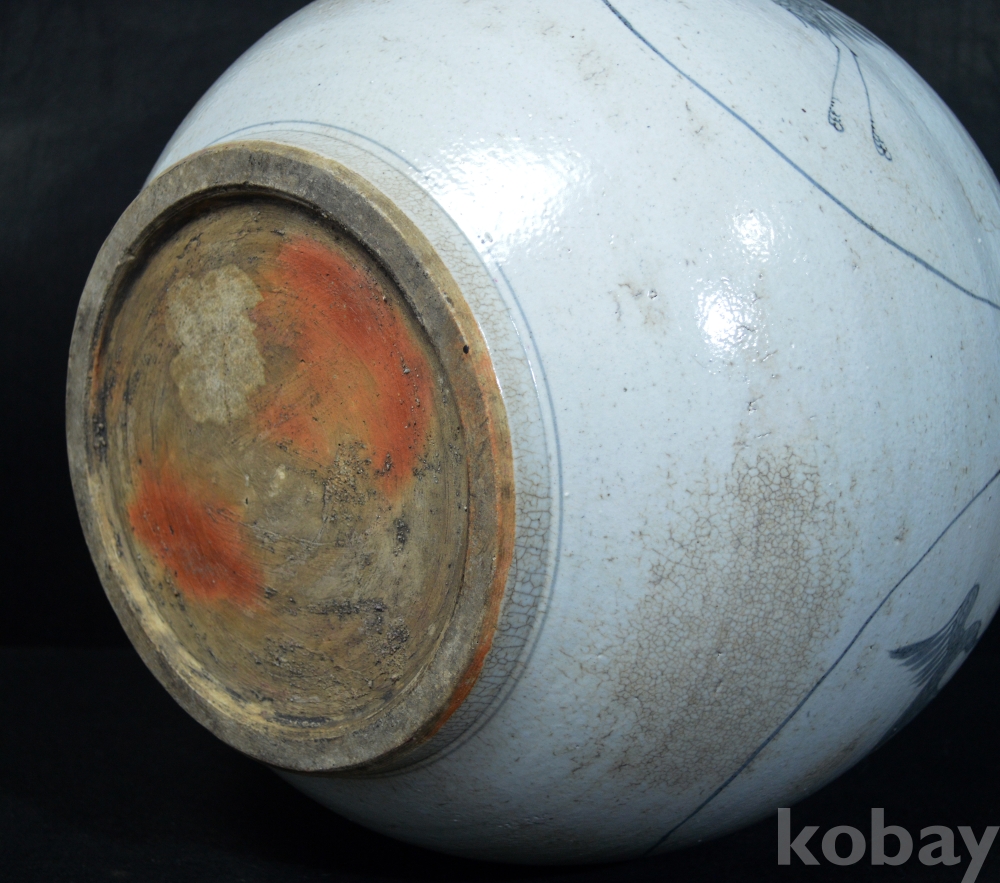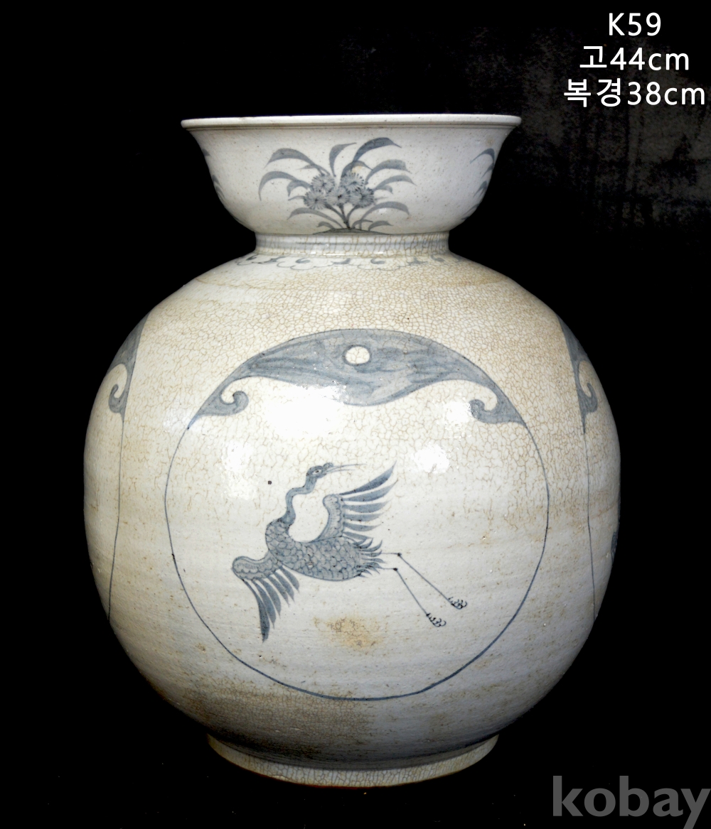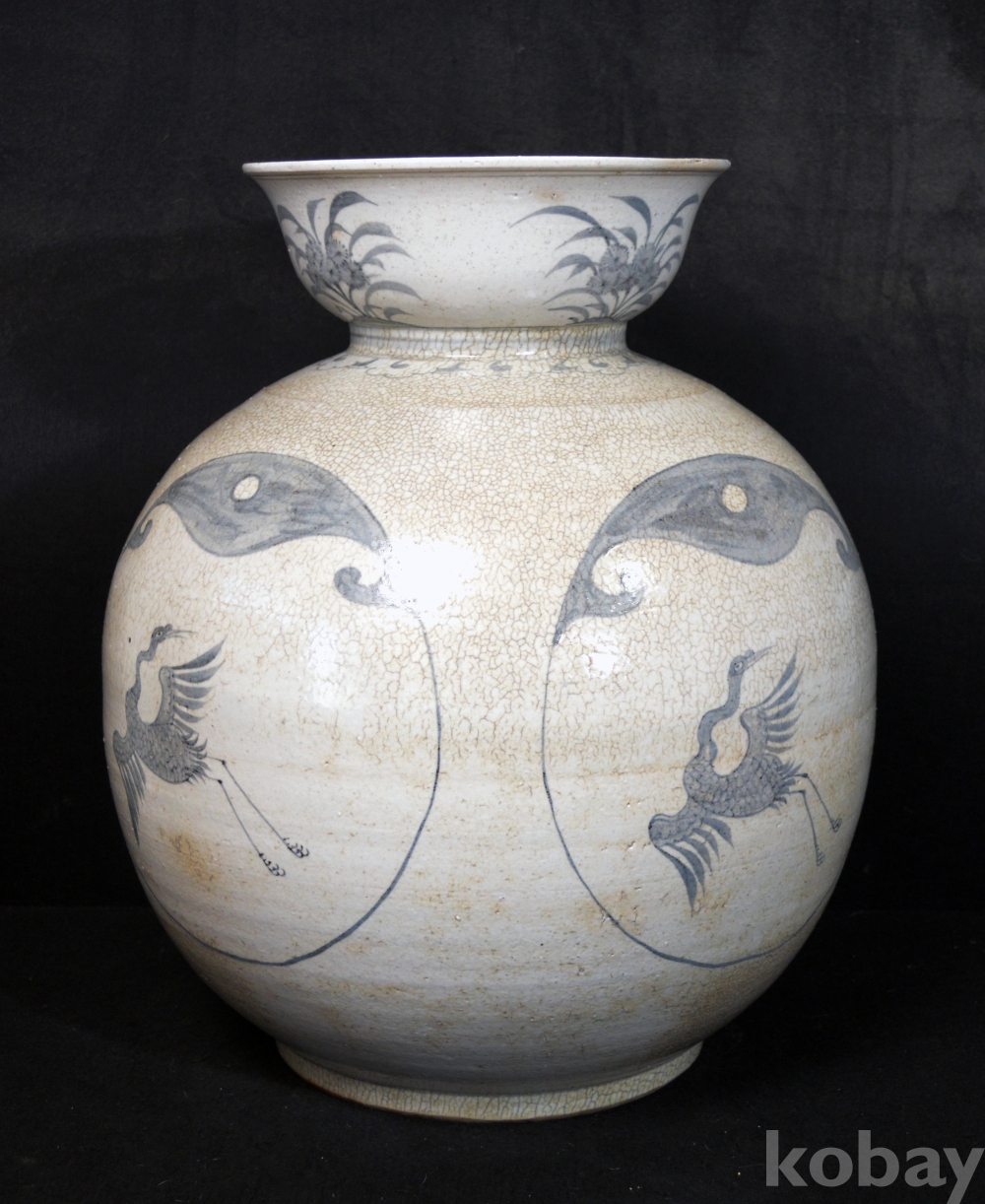 무늬도 아주 독특하여 원형의 개광 안에 구름에 가려져 희미해진 보름달 아래 학이 갈 곳을 잃고 날개짓 하는 낭만적이 장면을 그려 놓은 수준급의 명화(名畵) 입니다. 목에는 여의두문을 둘러 놓았고 올려놓은 사발에는 국화꽃을 수 놓았습니다.