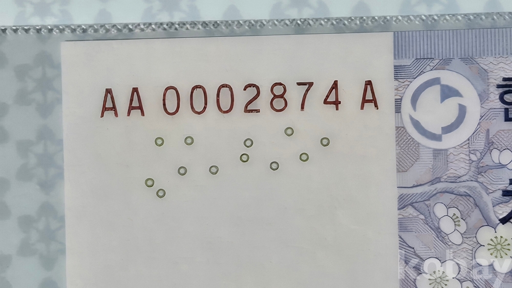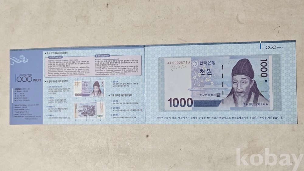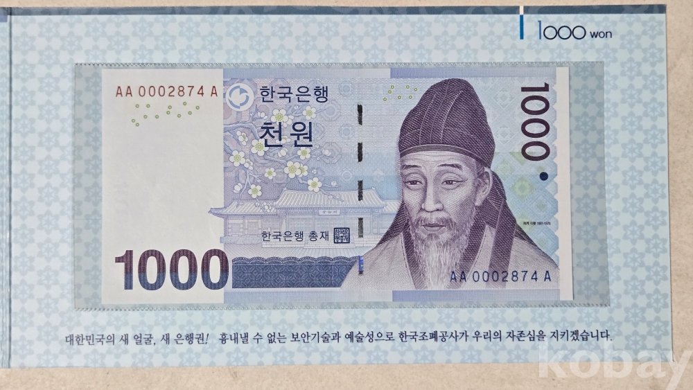 시중에 발행된 번호중 2000번대 빠른 번호 .초판 2874번 =1만 (10000매) 한정 공급한 한정판 / 초판 천원(1000원)권 경매첩