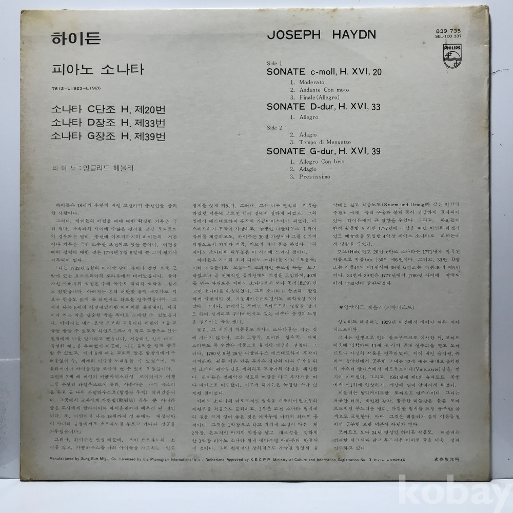 LP 30,940-112 하이든 피아노소나타 제20번 제33번 제39번 -잉글리드 허블러 . 자켓 EX 알판 NM 77 년 국내반