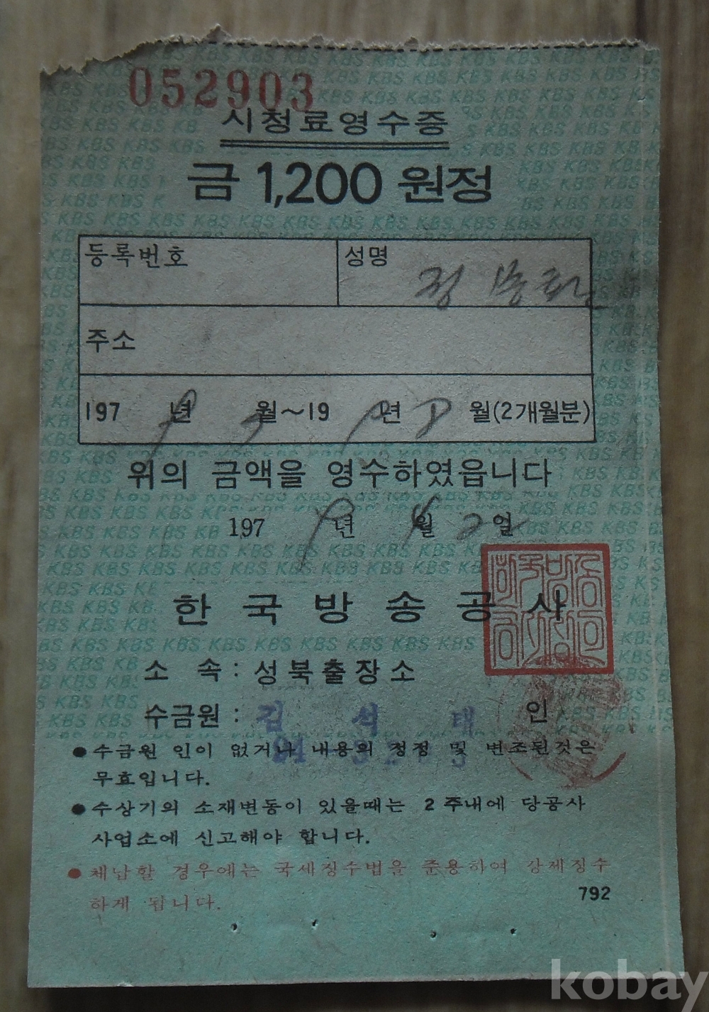 1979년 1200원 시기 한국방송공사 시청료영수증