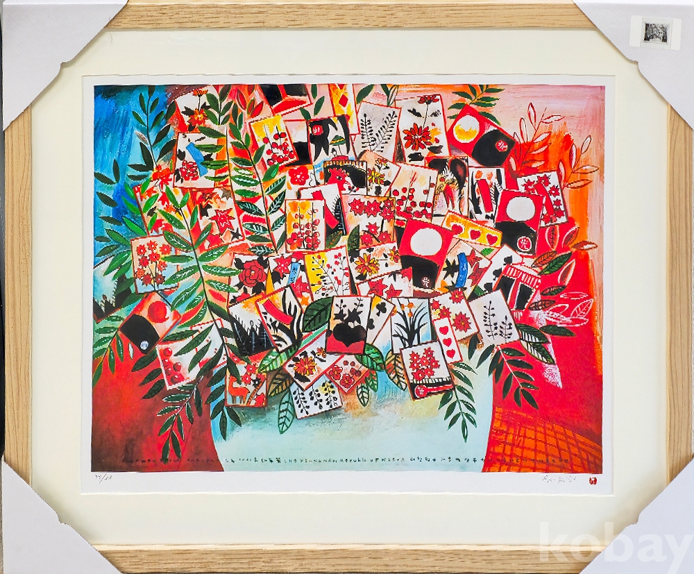 화투 이미지를 모티브로 한 꽃 형상이 화면을 가득 채우며, 작가 특유의 강렬한 색채와 한국적 상징성이 잘 드러납니다.