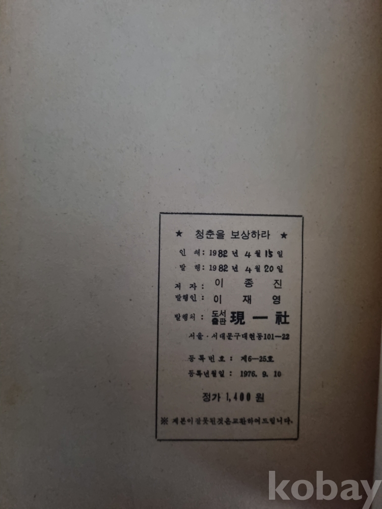 청춘을 보상하라 이종진 현일사 1982