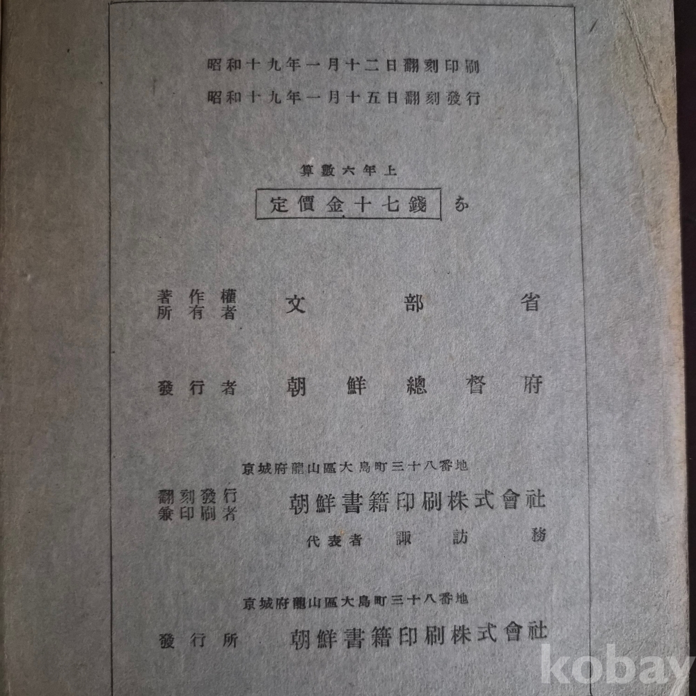 소화 19년 조선총독부 발행 초등과 산수(은진공립초등학교 제 12소대) 이며