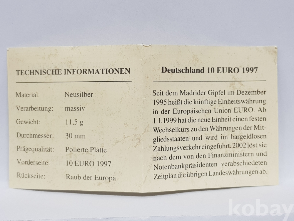 - 1997년 독일 10유로 기념주화 - 보증서 포함