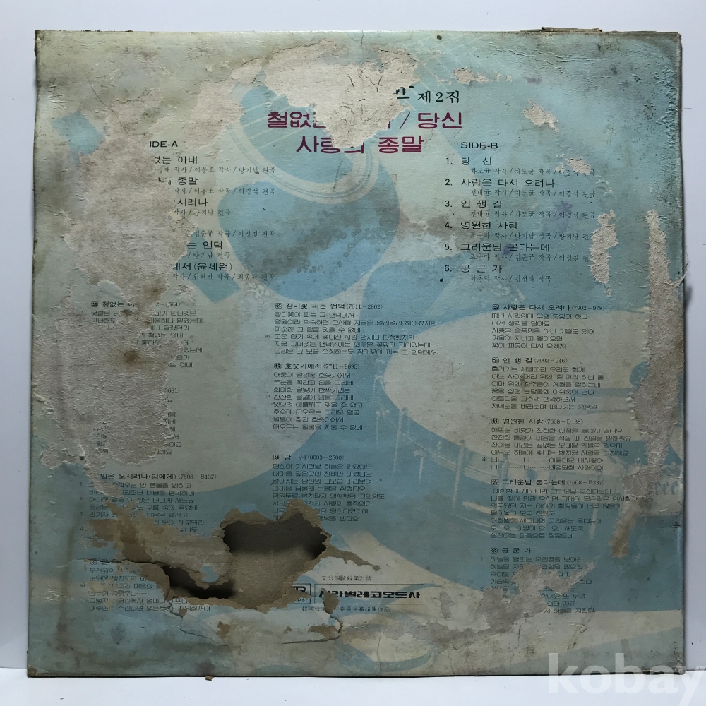 | 자켓상태 | VG : 주름, 접힘, 모서리 찢김 다수 | 음반상태 | EX : 재생에 영향 없는 가벼운 기스 존재 | 발매정보 | 알수없음 | 가사지여부 | 무 |