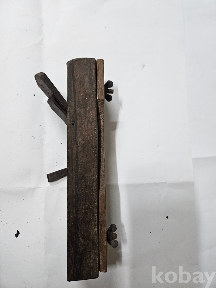 나비 너트 (Wing Nuts): 좌우에 두 개의 나비 너트와 나사(볼트)가 보이며, 이는 도구의 폭이나 높이를 조절하거나, **대팻날(또는 칼날)**을 고정하는 역할을 했을 것으로 보입니다. 이는 특히 현대의 마킹 게이지나 일부 특수 대패에서 볼 수 있는 구조입니다.