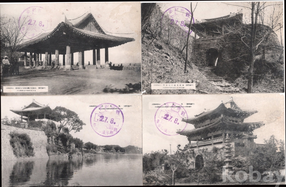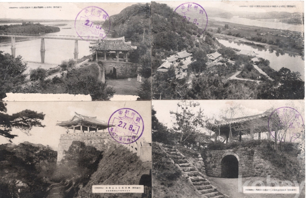 대동강 대동강변기암 을밀대 을밀대전경 현무문 칠성문 정자 대동문등 사진엽서8매와 피봉 1점입니다.