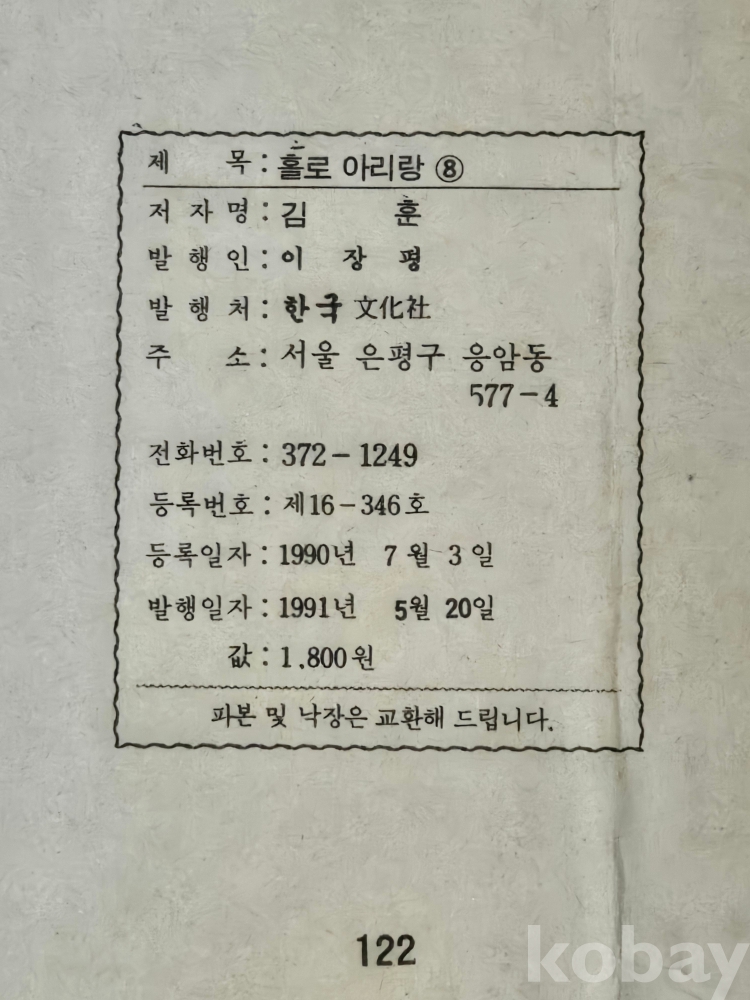 김훈 글.그림= 1991년 홀로아리랑 8권 완질