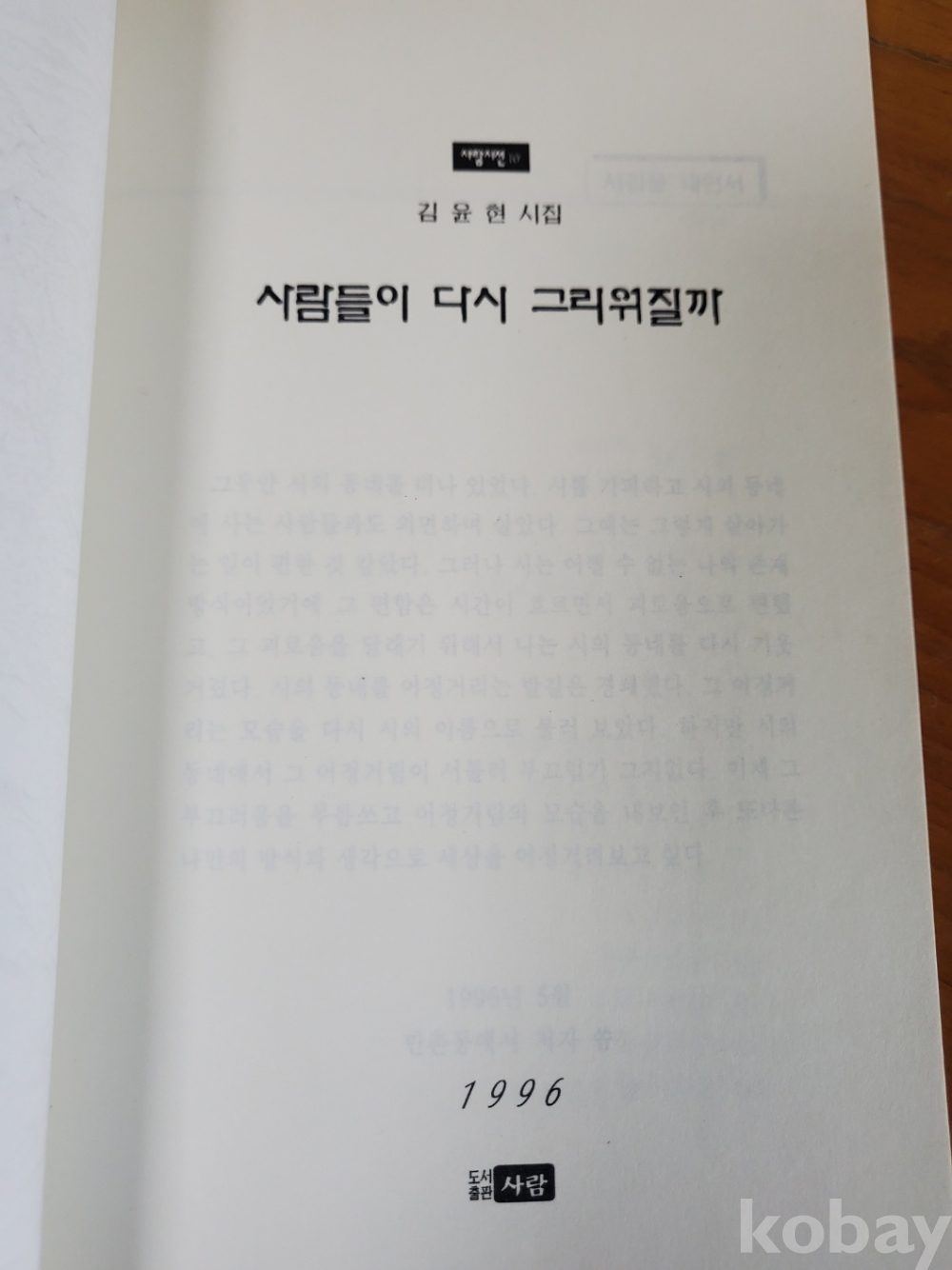 1. 사람들이 다시 그리워질까, 김윤현, 도서출판 사람, 1996년, 115쪽, 저자 서명본, 상태 상, 사진 참조