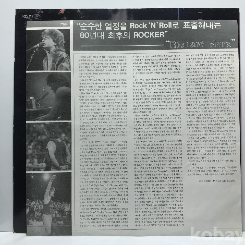 LP 83,740-125 Richard Marx - Repeat Offender . 자켓 EX+ 알판 EX 89 년 국내반
