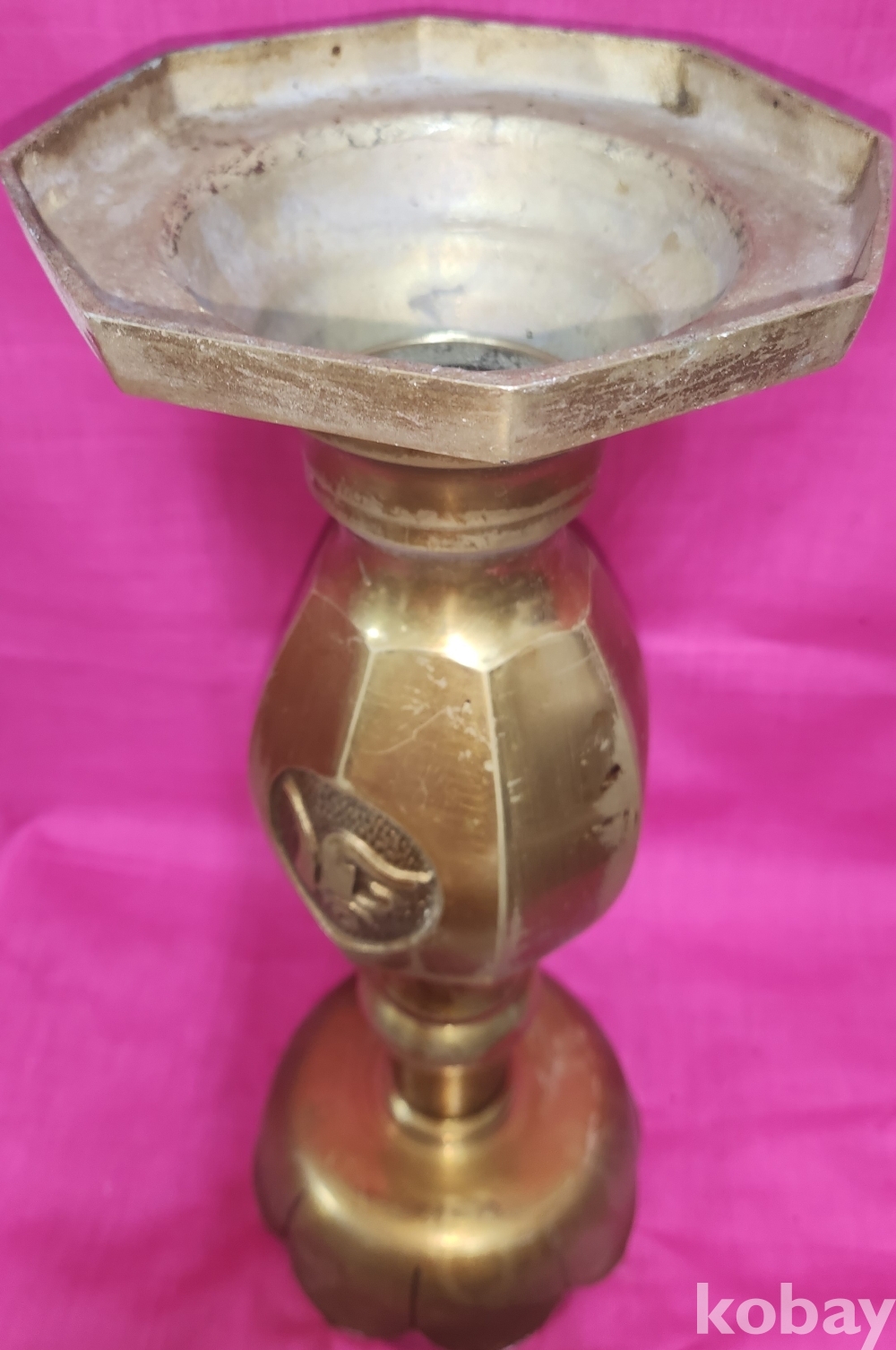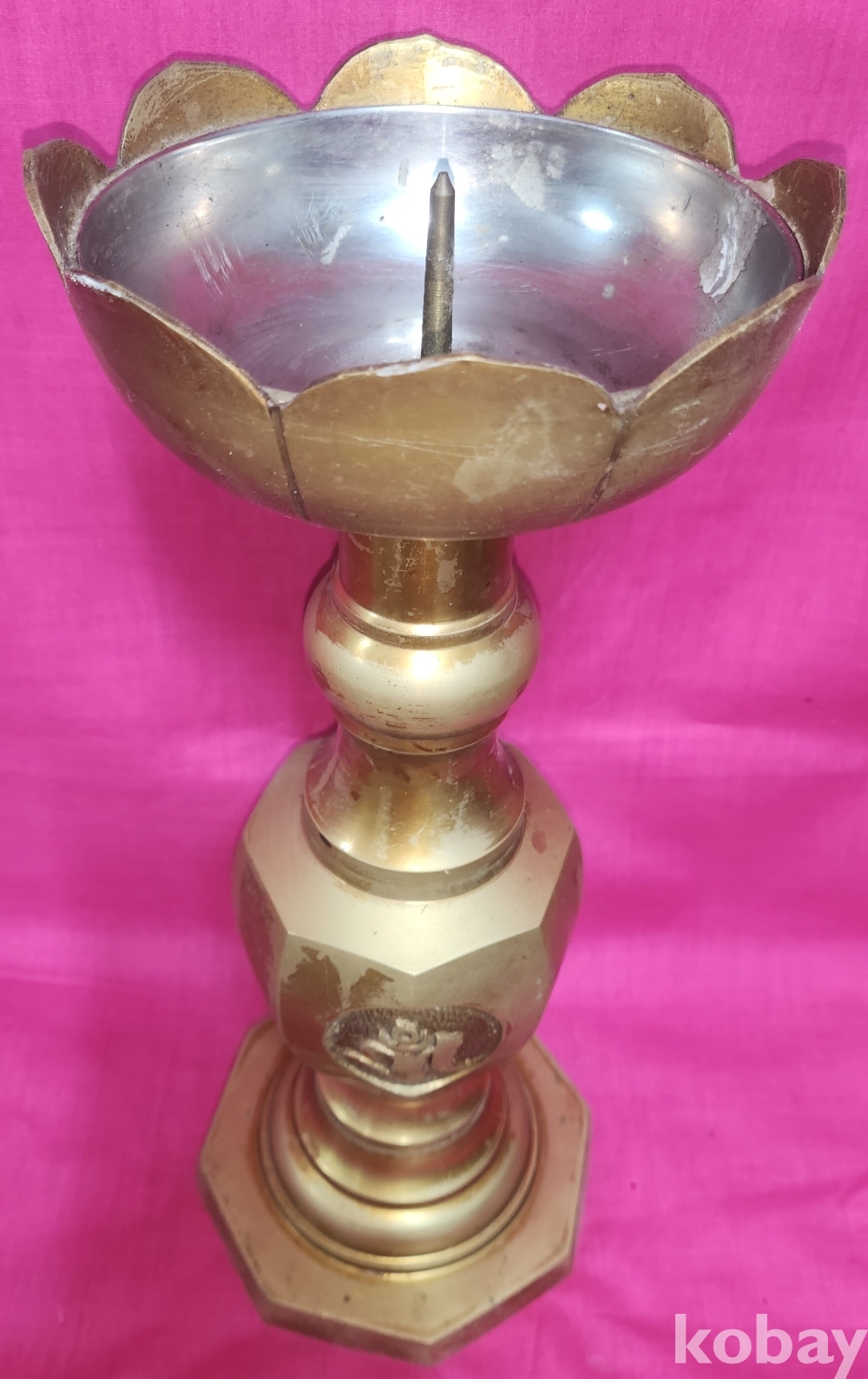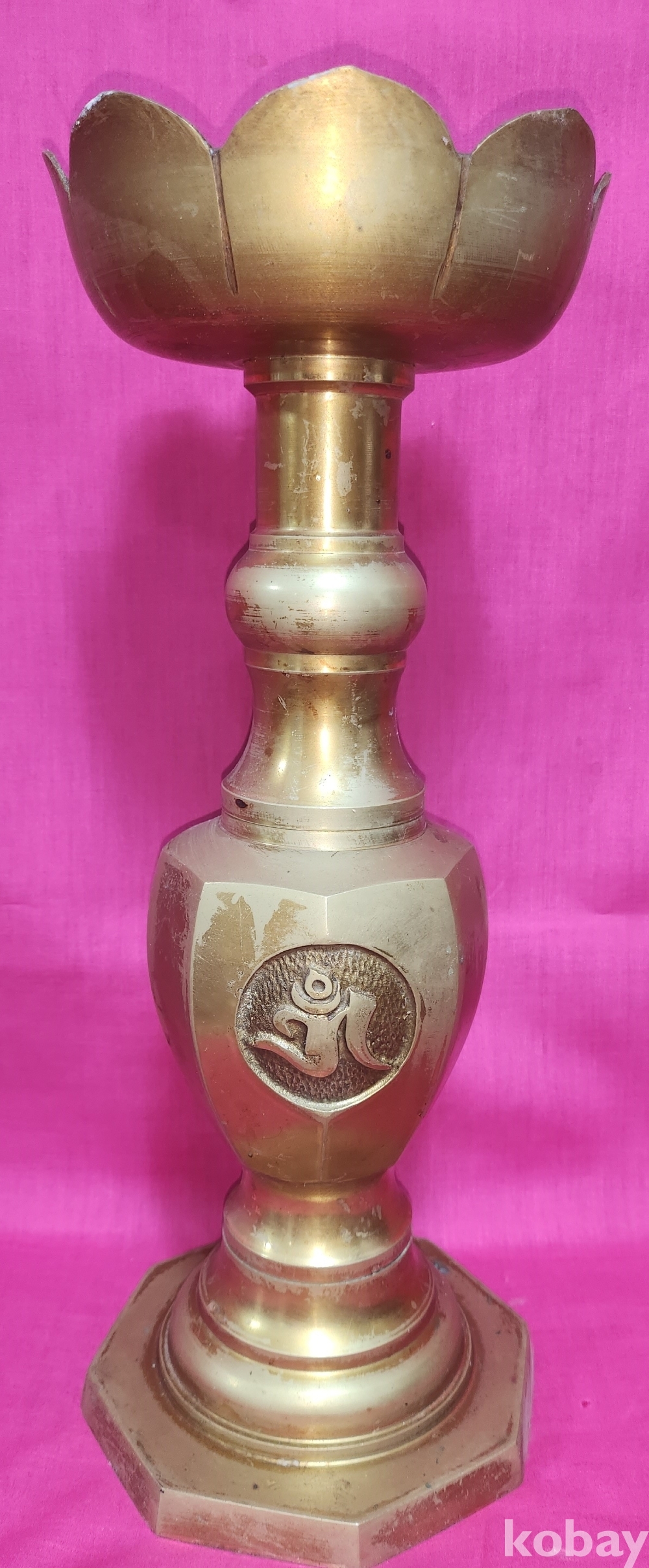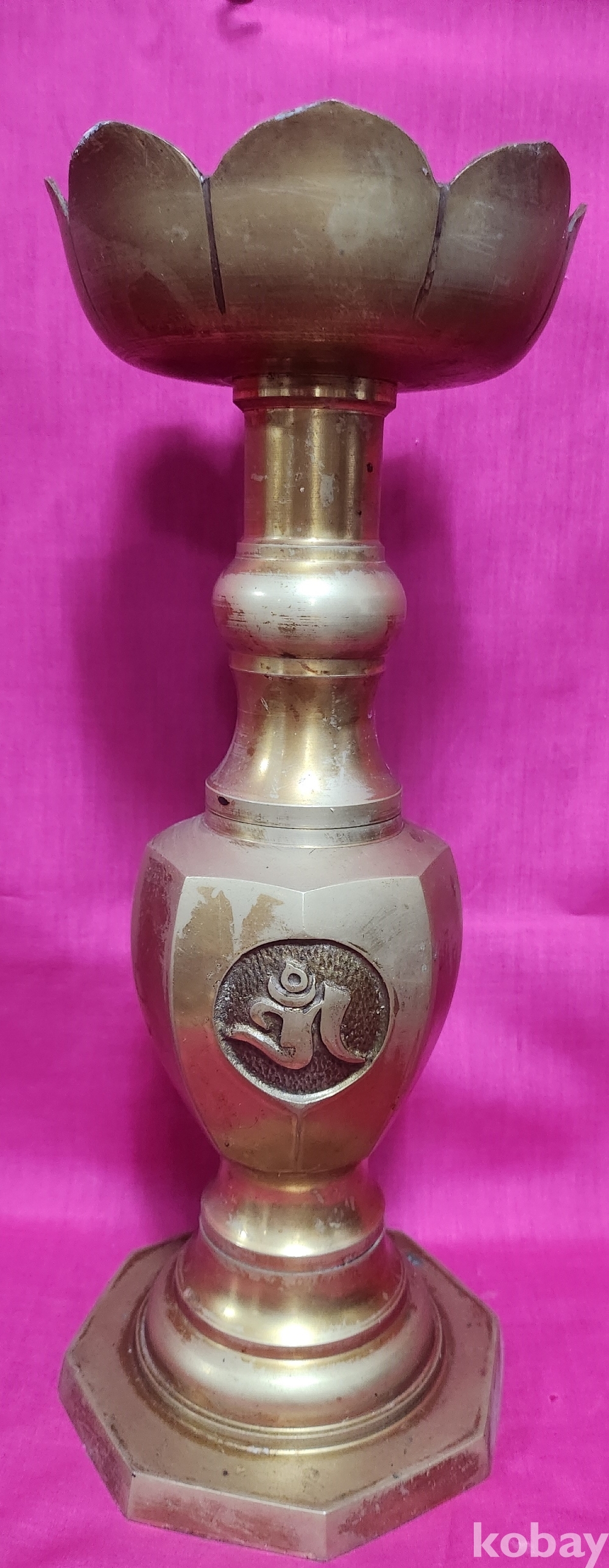황동으로 만든 불심(佛心) 문자와 옴마니반메훔(唵麽抳鉢銘吽) 뜻 문양 화형 8각 촛대입니다,