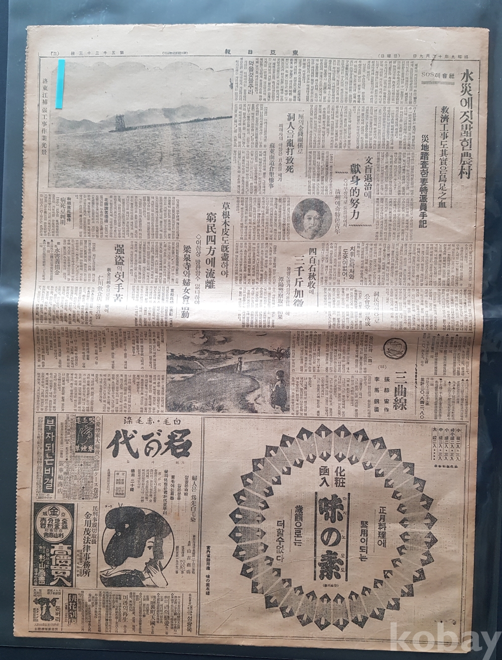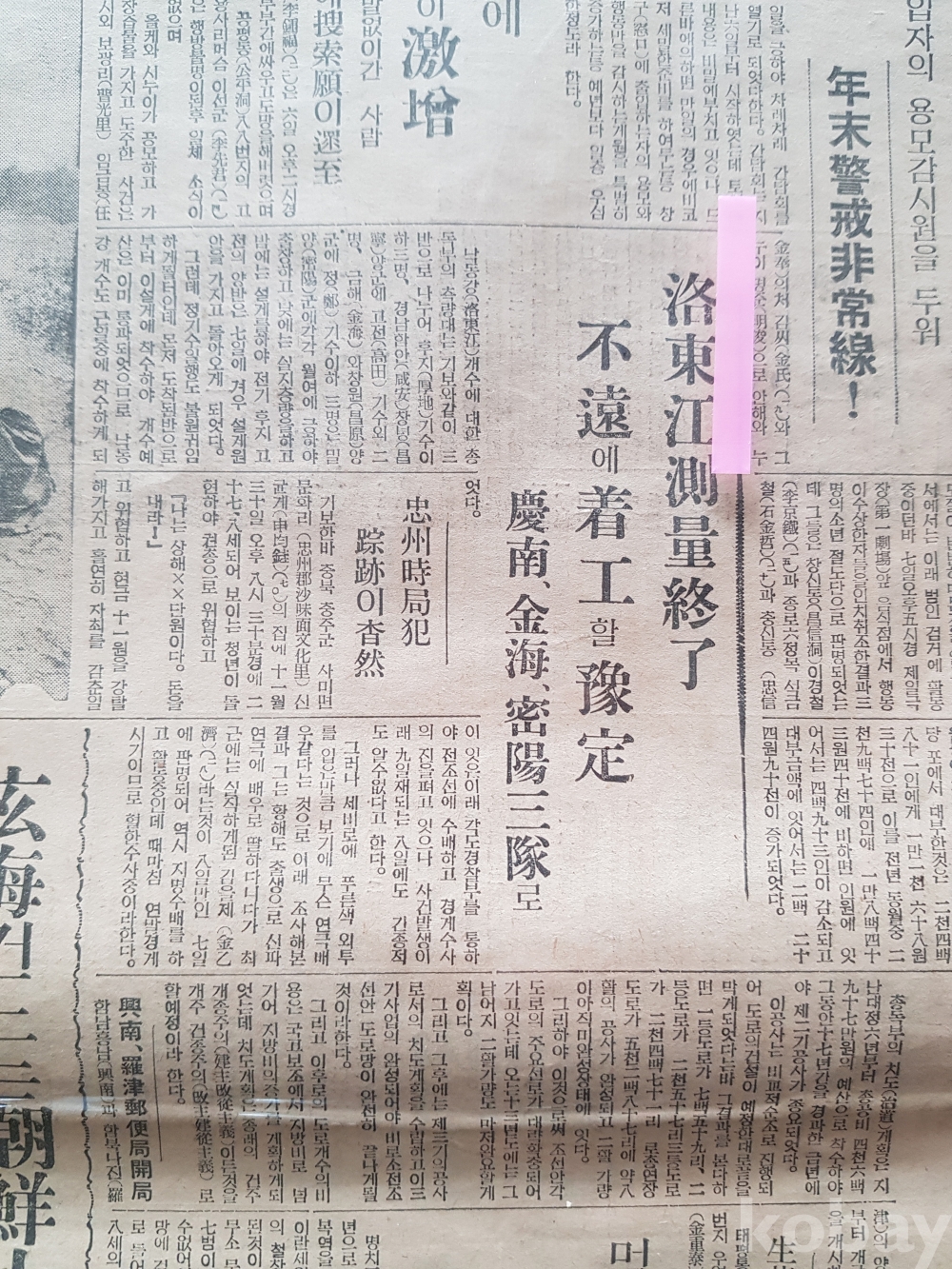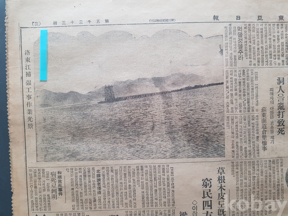 [동아일보]*‘洛東江測量終了’ 기사가 실린 1934.12.9. 이외에도 洛東江補强工事作業光景 사진이 실려있다. 총 4면