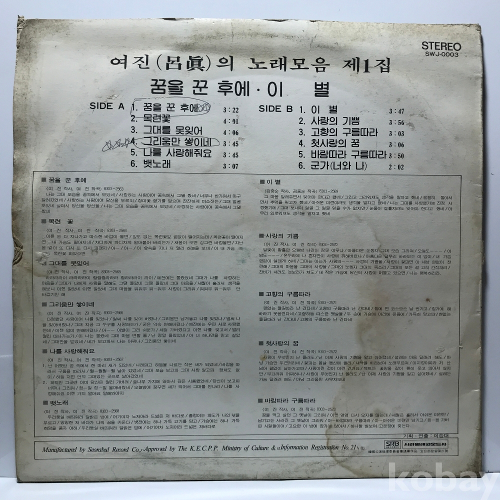 LP 22,447-43 여진 1집 - 꿈을 꾼후에/ 이별 자켓 EX- 알판 EX EX- 85 년 국내반