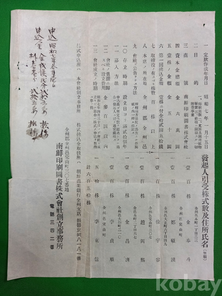 일제강점기 전주 지역에서 출판 및 인쇄 사업을 목적으로 설립된 회사의 구체적인 면모를 보여주는 역사적 자료입니다.