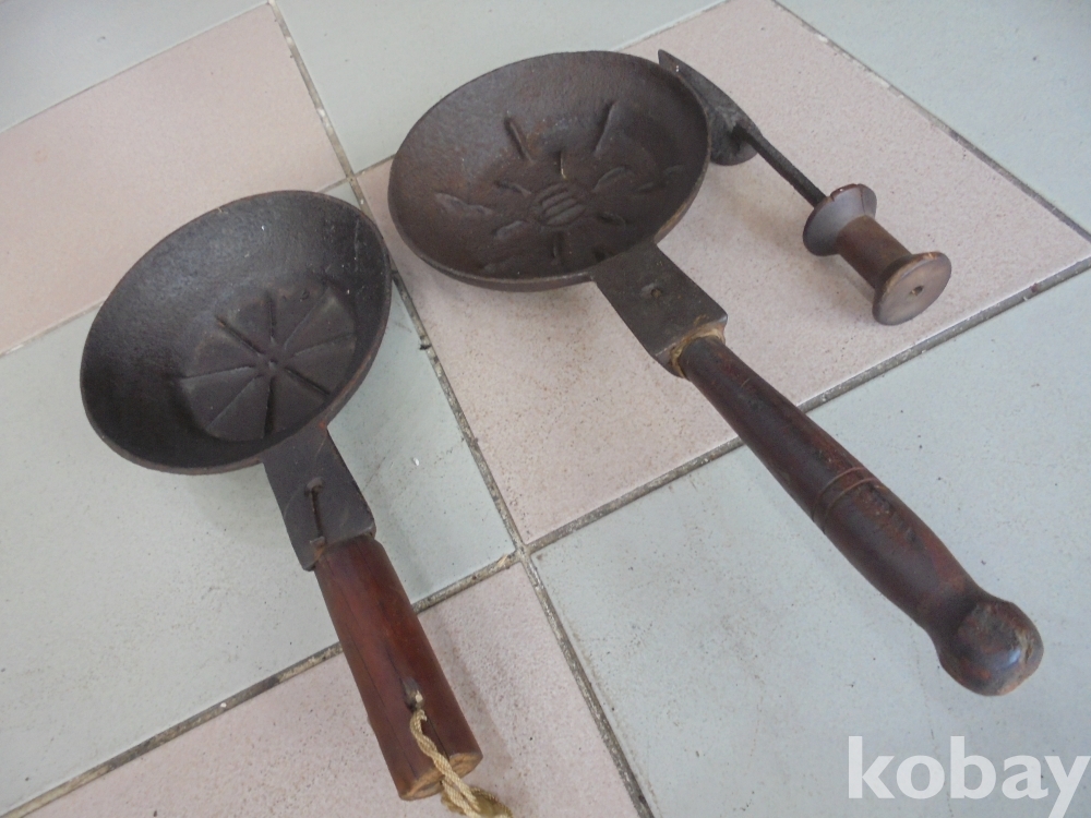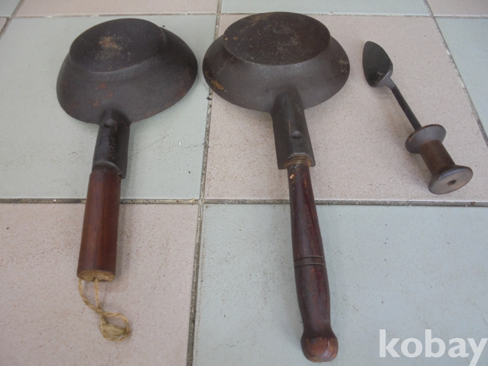 오래되고 질이잘들은 무쇠 숯다리미 2점과 특이하게 실패로 자루한 순수한 무쇠인두 1점 숯다리미 지름18 cm 길이 40 cm 외사진참조