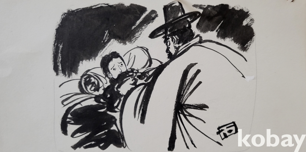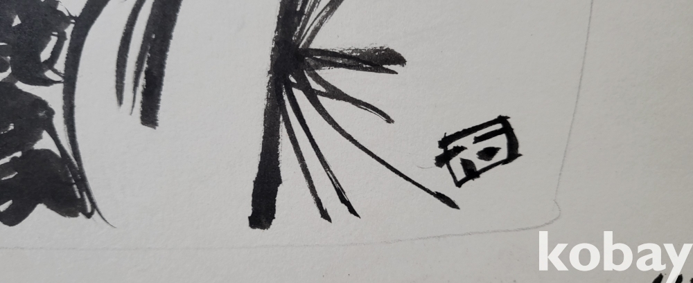 물과 먹으로 만 직접 그려진 수묵화 삽화입니다,
