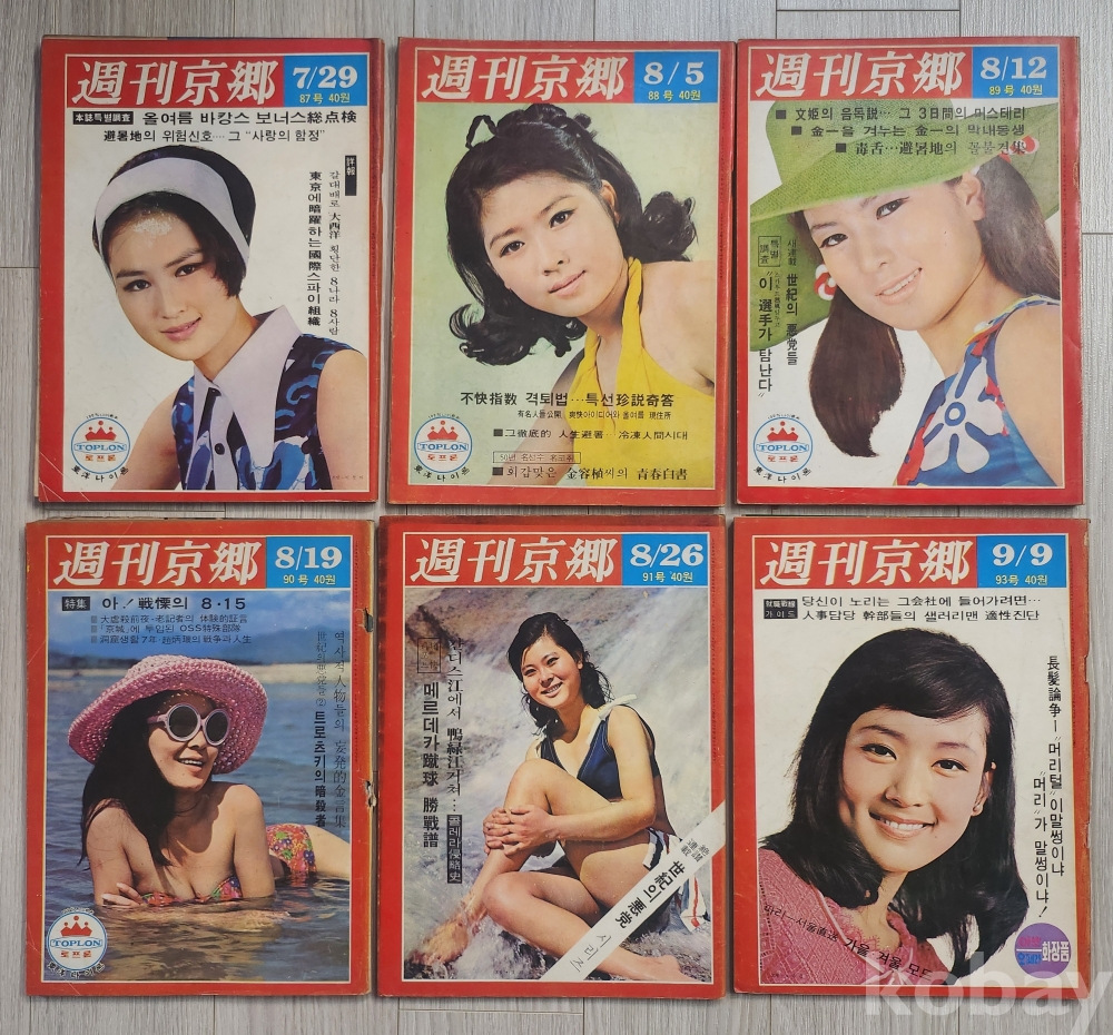 1970년도 주간경향 (가격40원) 6권 입니다 87.88.89.90.91.93호 입니다 당대 광고 이슈거리들이 실려 있습니다 상태 양호합니다