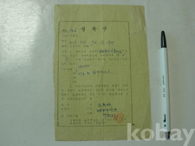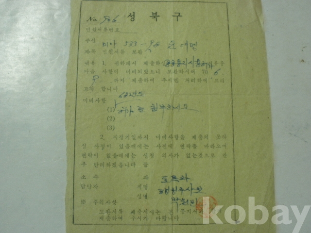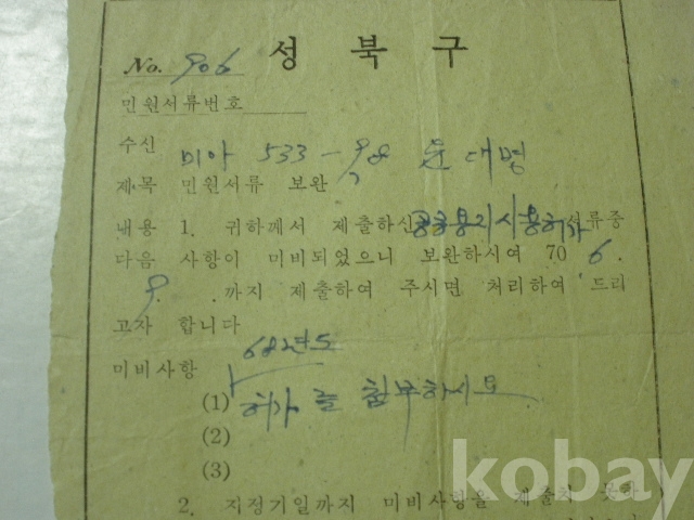 민원서류 보완 - 공공용지 사용허가 서류증 68년도 허가를 첨부하시요 (1970년)