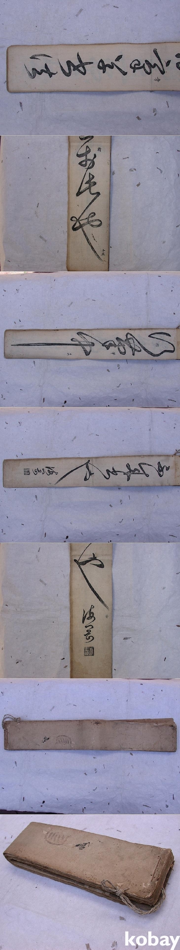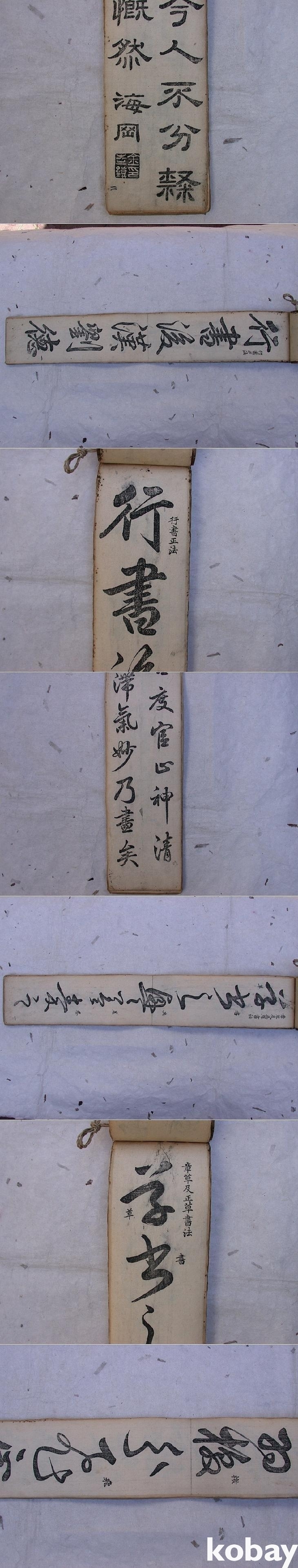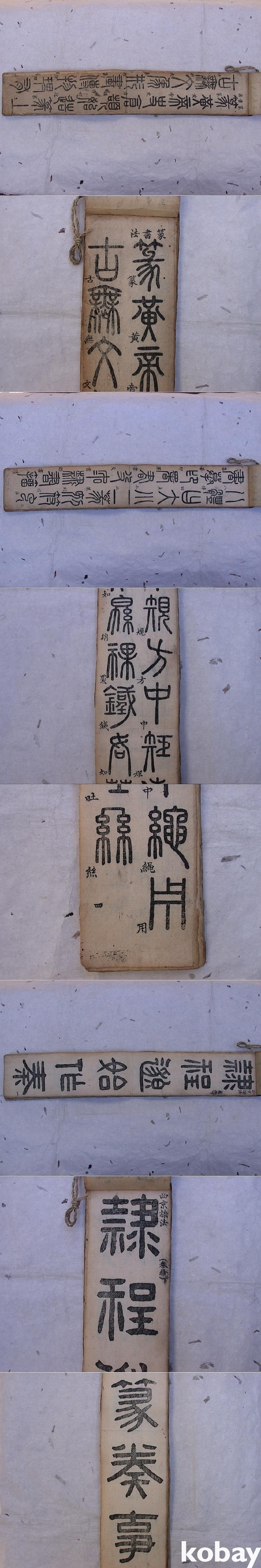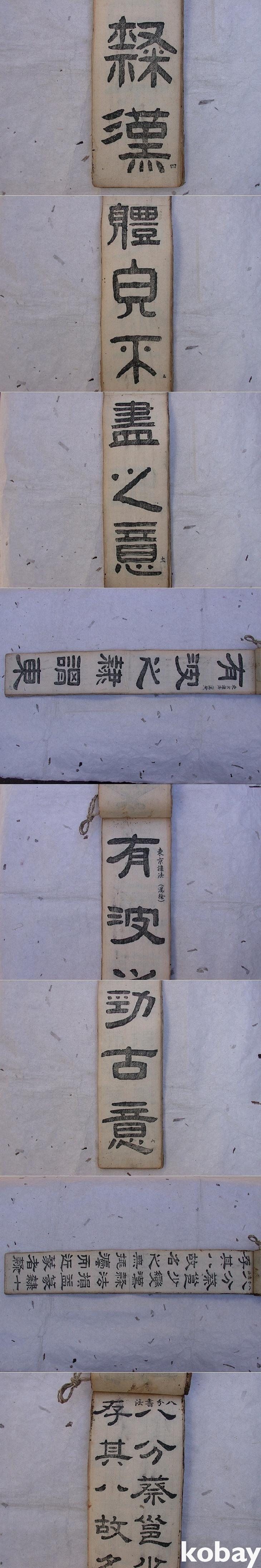 ▒ 10×62cm. 각 장은 절반 길이인 31cm 길이의 한지에 단면으로 찍은 목판 두 장을 길게 연이어 배접하여 세로로 이어붙였으며, 서체별로 장수를 매겼고 두꺼운 종이를 표지로 삼아 상단을 노끈으로 묶어 걸어놓고 볼 수 있도록 만들었다. 전서4장 + 예서장18장(진예12+한예6) + 팔분2장 + 행서6장 + 초서20장으로 모두 50장이다.