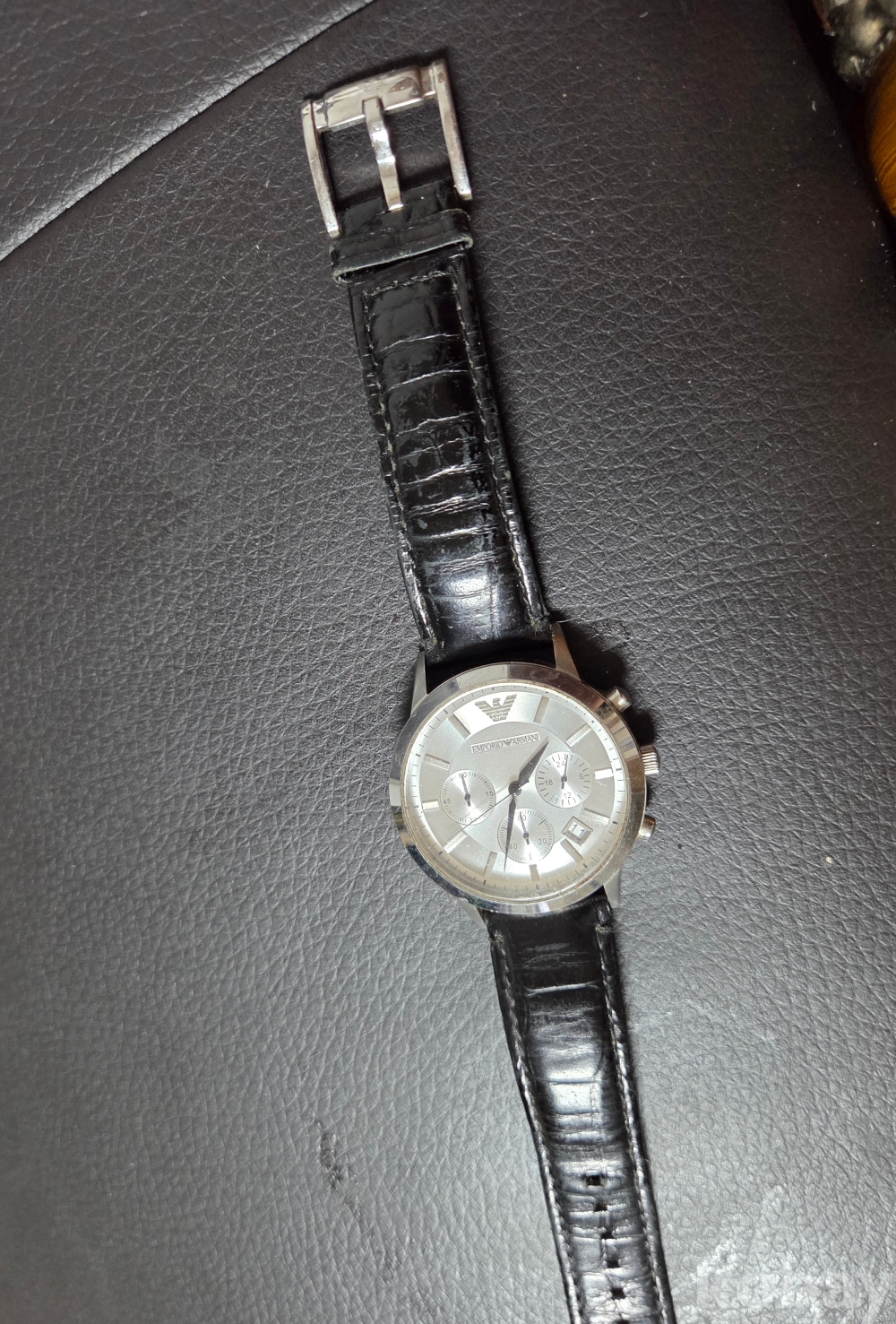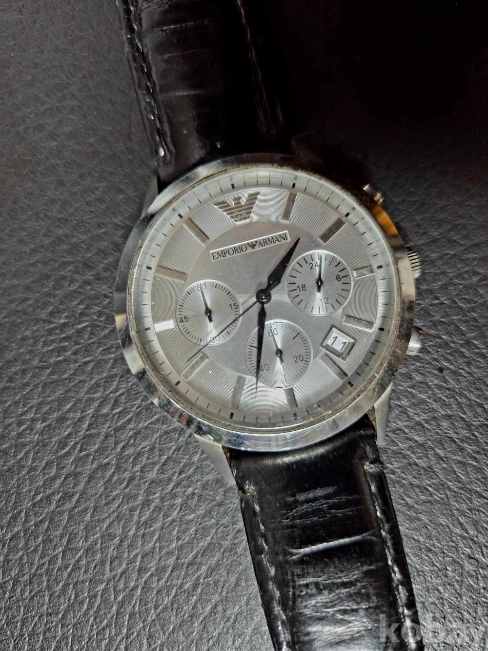 다이얼 하단에 **독수리 로고(Emporio Armani 상징)**가 명확히 보입니다.