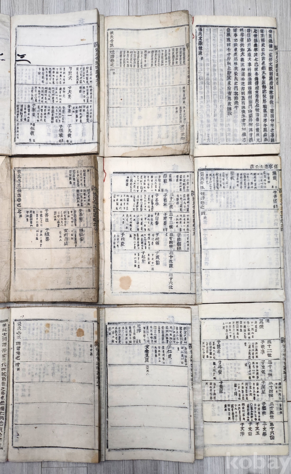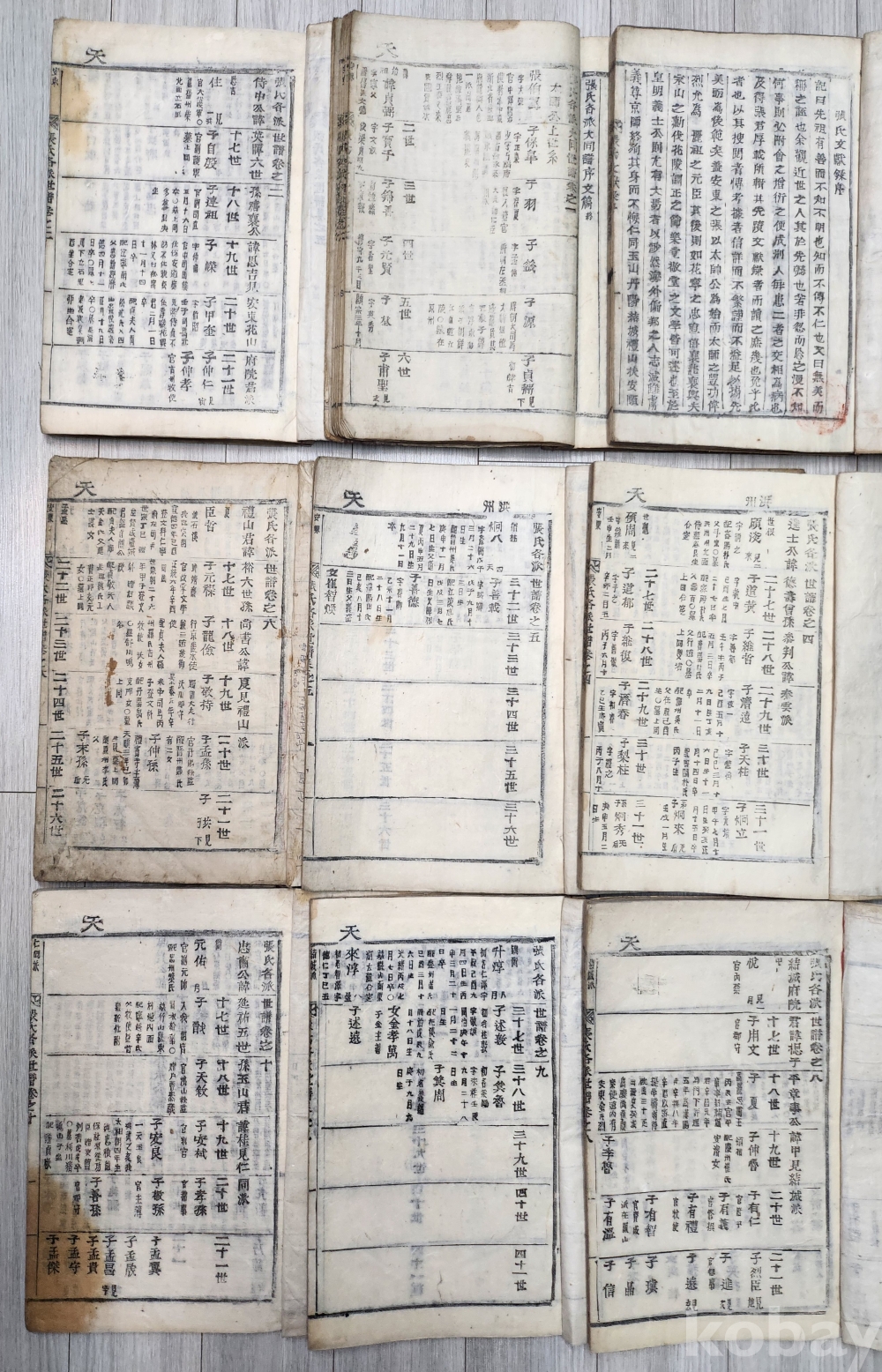 1928년 안동장씨 각파 대동세보 10권9책 (완질 ) 입니다 1책은 안동장씨서문 1-10권 8책 각파세보 합 9책 입니다 안동장씨 각파세보 각파의 계보와 후손정보를 체계적으로 기록한 목활자본 입니다 2책이 2-3 6-7권으로 되어 있습니다 서문에 숭정5회 임자중추라고 되어 있습니다 표지에 기름흔적있으나 내용 깨끗합니다