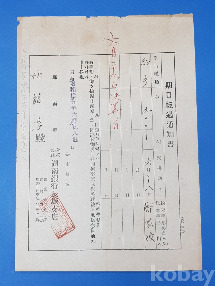 **** 1940년 호남은행장성지점 약속수형(어음) 기일경과통지서