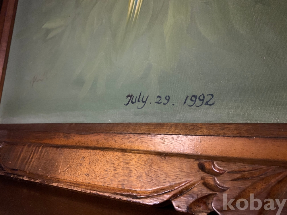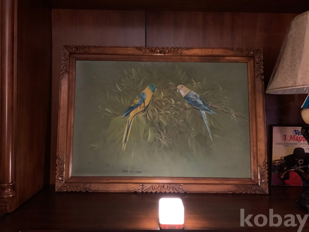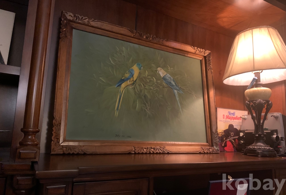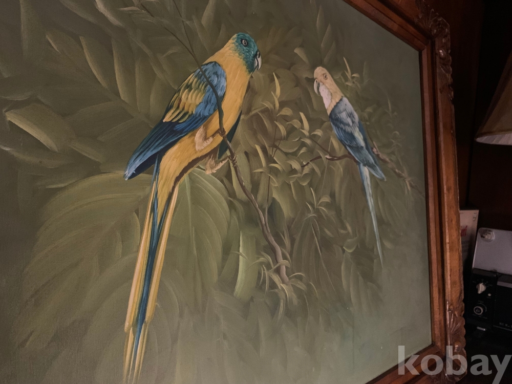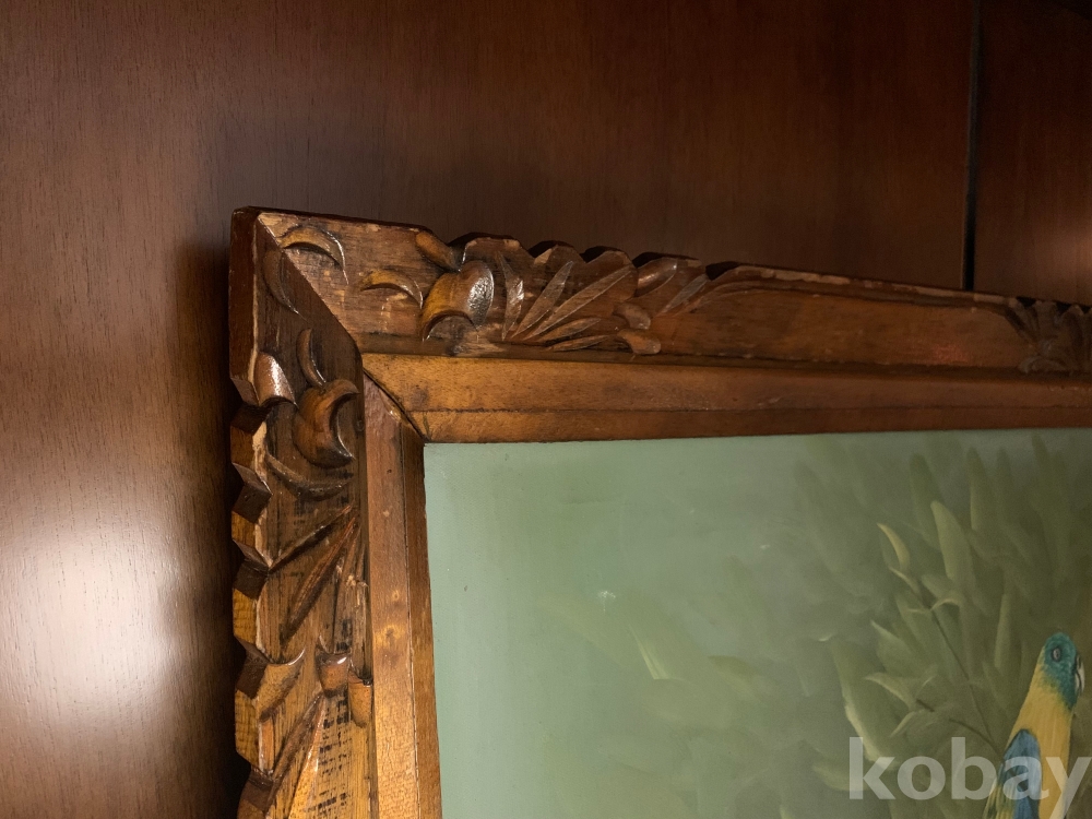 제법 연식이 있는 보기드문 고화로, 흔치 않은 앵무새를 소재로 한 유화 작품입니다.