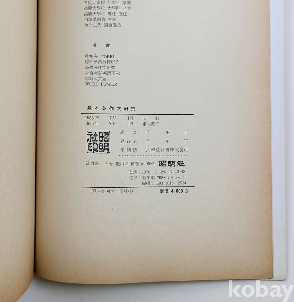 물 품 명 | 기본 영작문 연구 : 구문 ⦁ 문법 중심 + 해답책자 / 1986년 / 이재옥 / 소명사 |