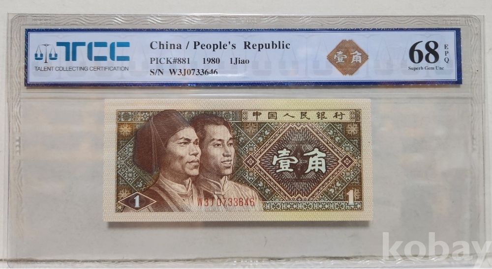 -1980년 중국 인민은행 발행 1각 지폐 TCC68 고등급 입니다.