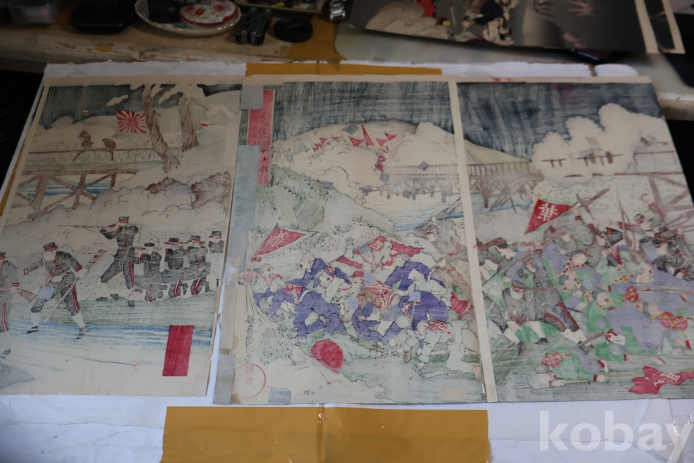 청군과 일본 군의 전쟁 평양 임니다 당시 전쟁 상황을 알린 오리지날 목판화 3 세트 연결 화 이며 세월의 흔적을 가진 귀한 목판화 임니다