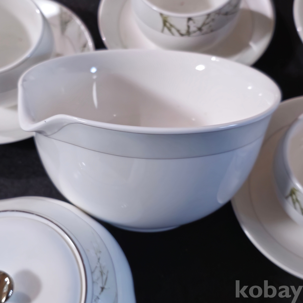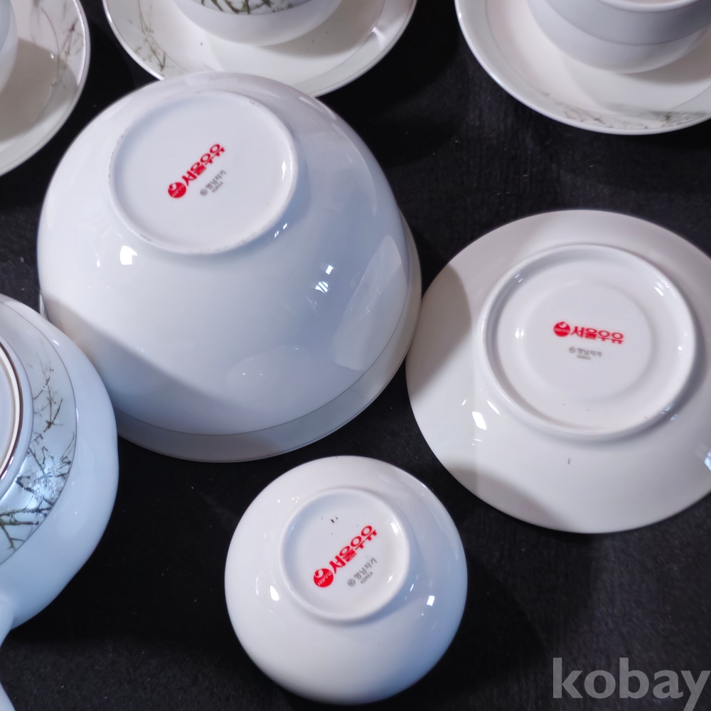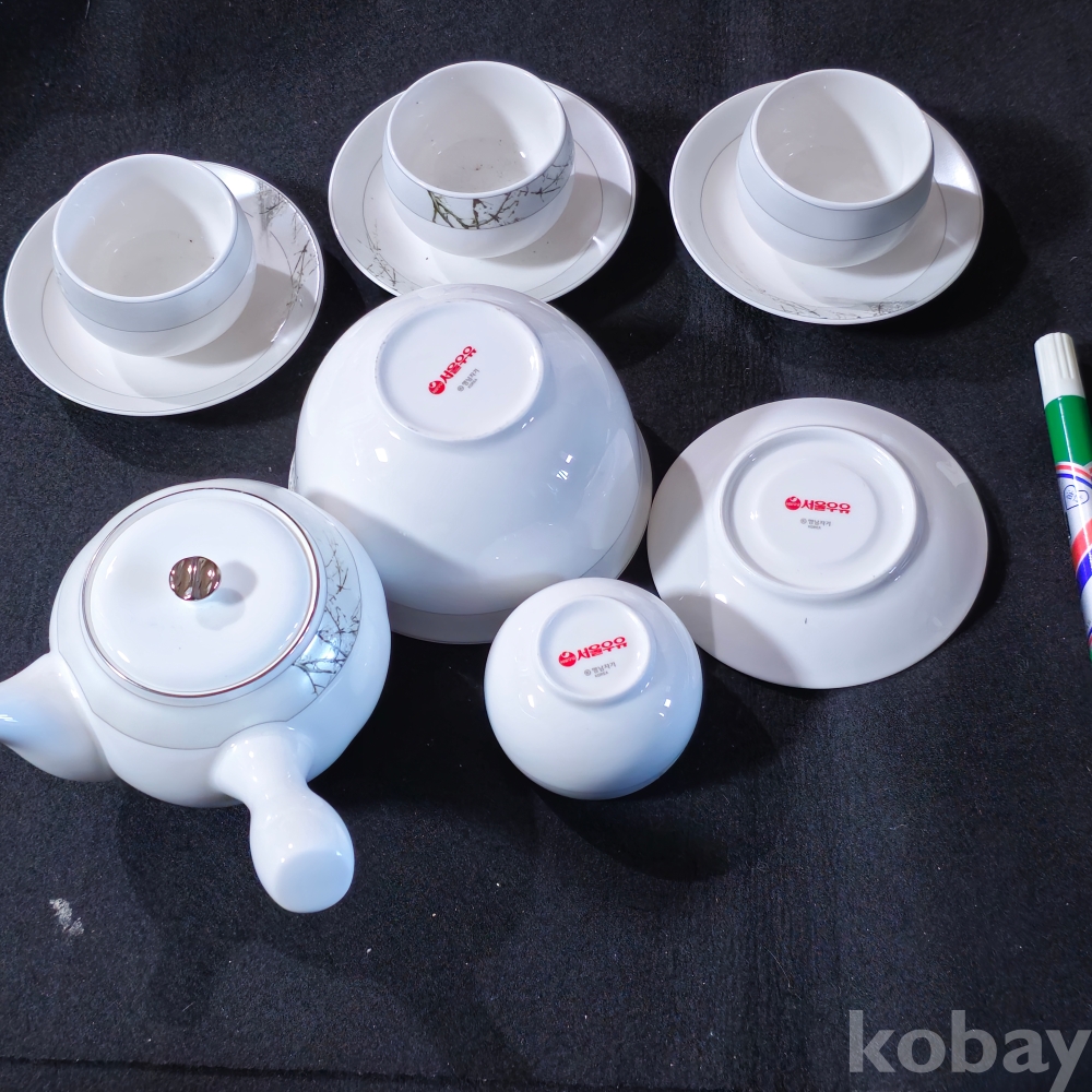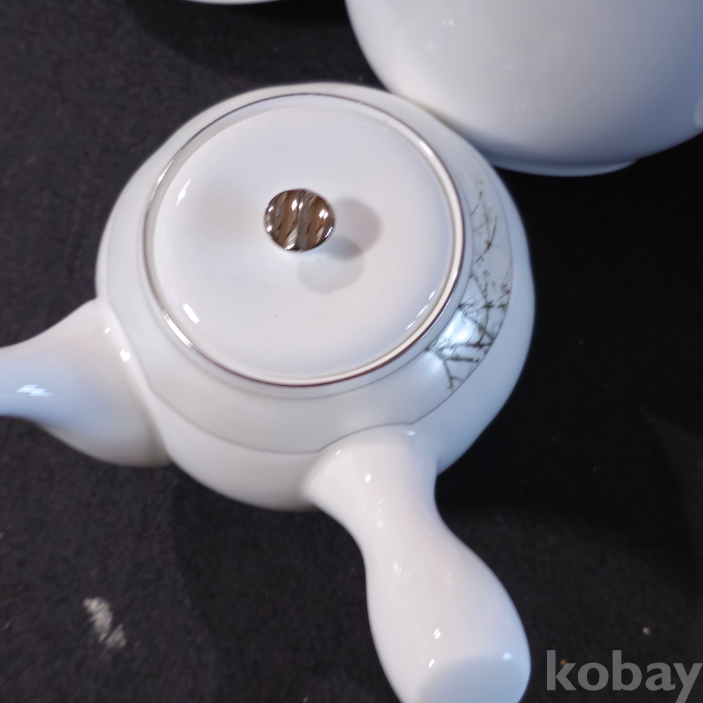 (((근현대사자료/도자기주전자))) 오래전 매화나무꽃 그림있는 행남자기에서만든 도자기 茶주전자/수구/찻잔4개/잔받침 4개 (서울우유)